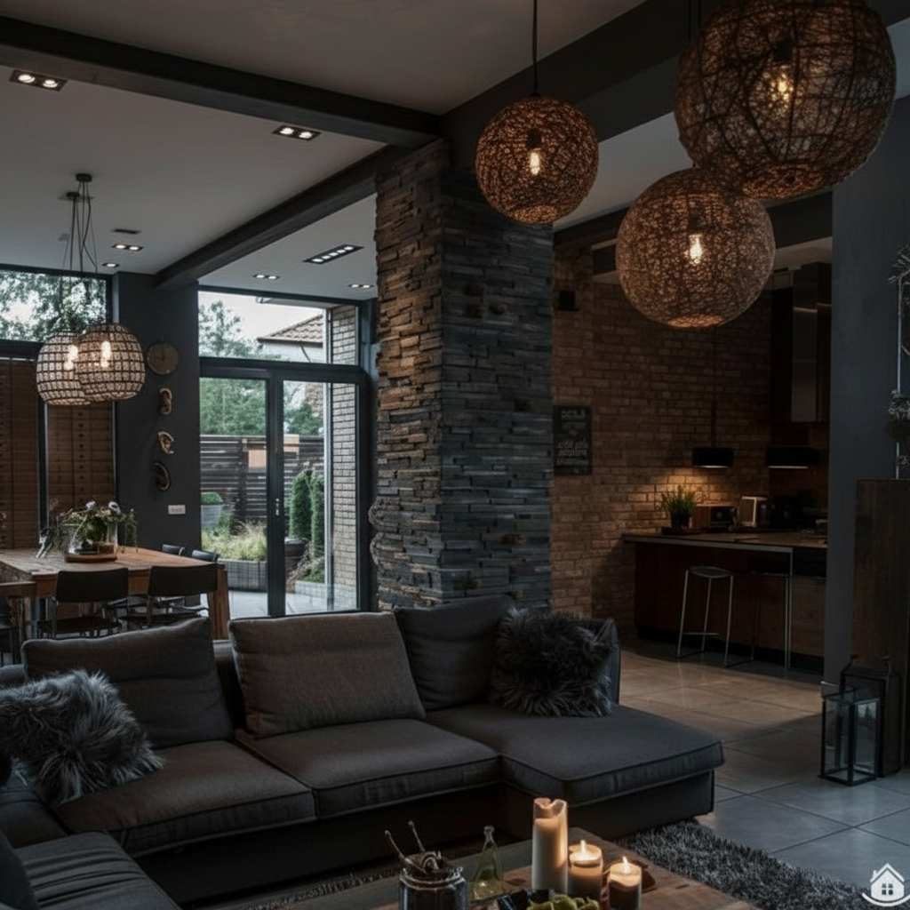 Das Wohnzimmer ist mehr als ein Treffpunkt. Es ist ein Ort der Entspannung, des Abschaltens und der persönlichen Rituale. Eine dunkle Inneneinrichtung unterstützt diesen Charakter und macht den Raum zu einem geschützten Bereich.