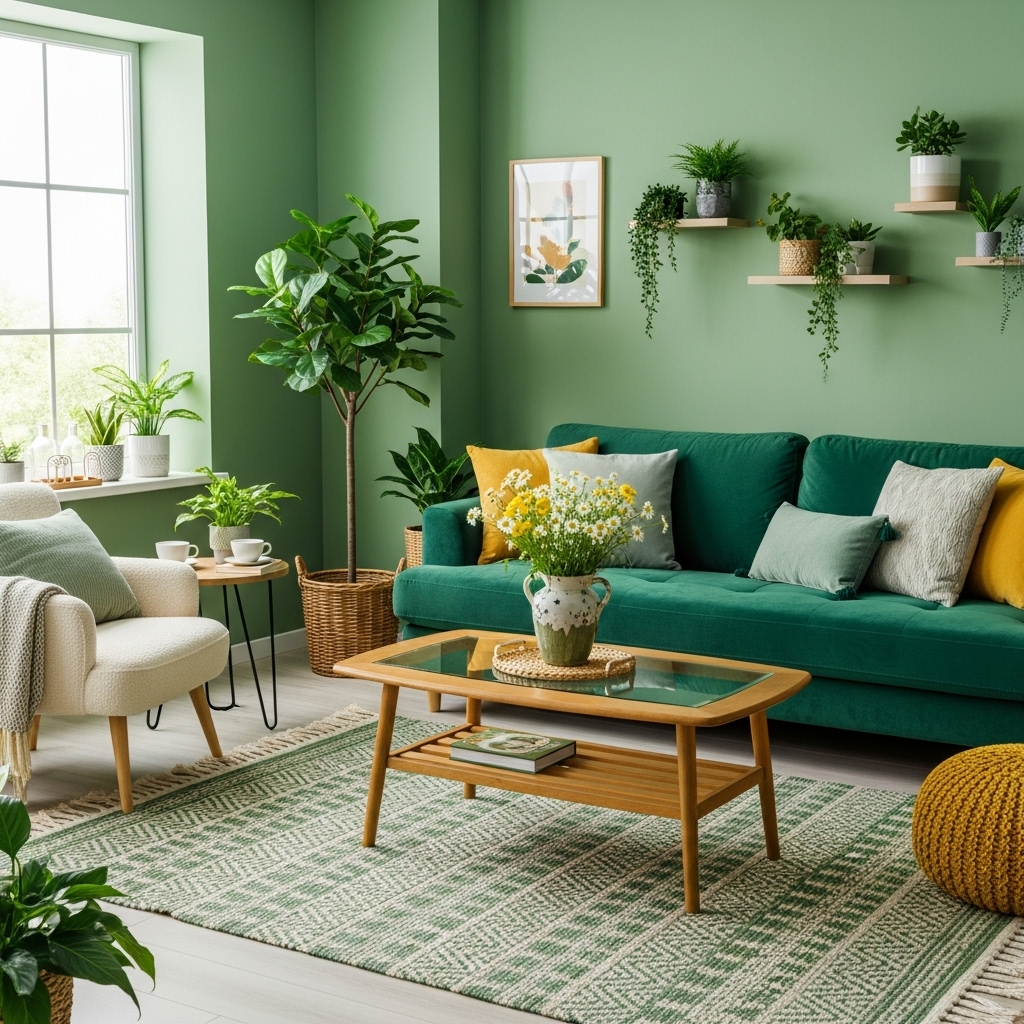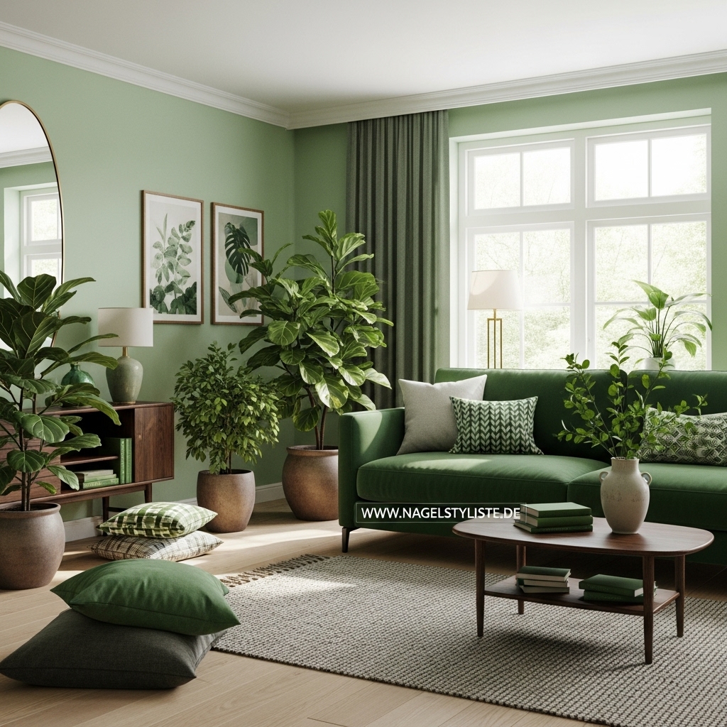 Das Wohnzimmer ist der Ort, an dem Alltag und Entspannung aufeinandertreffen. Eine grüne Inneneinrichtung unterstützt diesen Charakter, indem sie Ruhe vermittelt und dennoch lebendig bleibt.