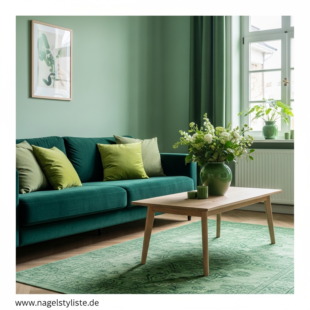 Ein rundum grünes Wohnzimmer wirkt geschlossen, ruhig und harmonisch, wenn Licht und Materialien sorgfältig gewählt werden.