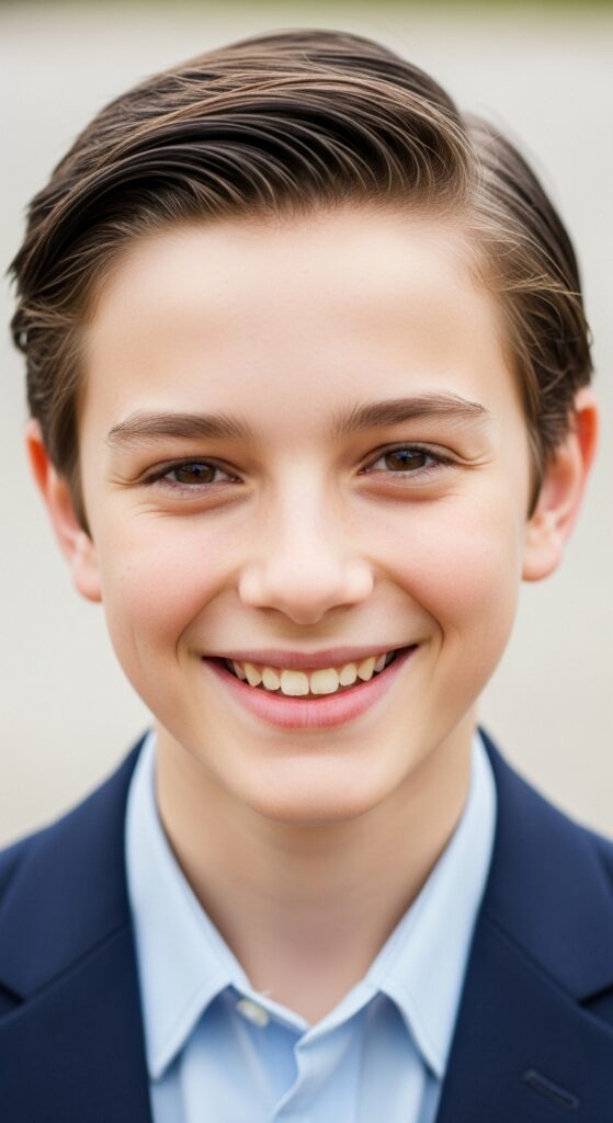 Kurze Seiten, etwas längeres Oberhaar – fertig ist der gepflegte Look, der sowohl im Alltag als auch zu besonderen Anlässen passt. Ein Favorit unter den kinderfrisuren jungs! 💇♂️