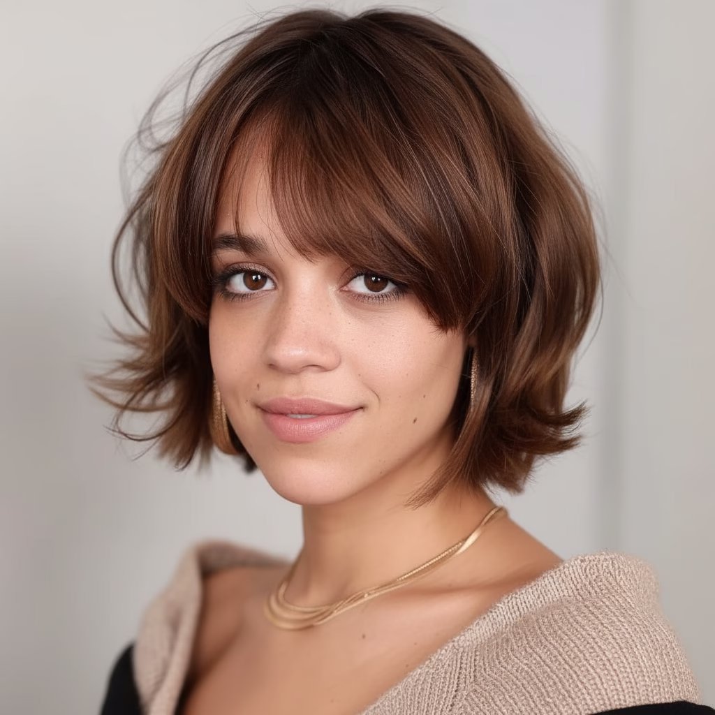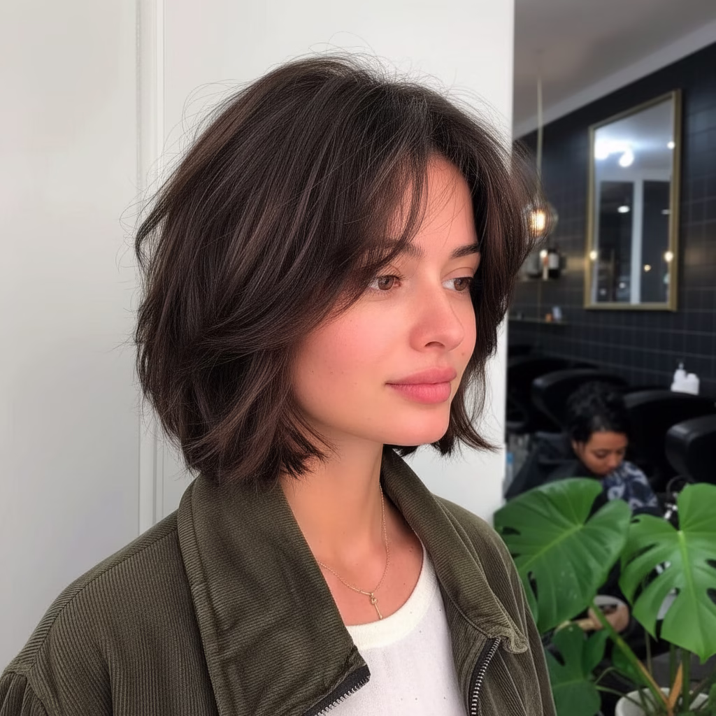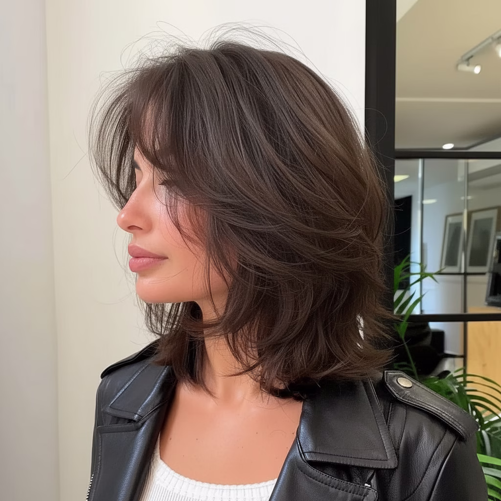 Auch kurze oder schulterlange Varianten sind möglich und wirken besonders modern. Die Stufen geben kurzen Längen mehr Ausdruckskraft, ohne den Schnitt zu streng erscheinen zu lassen. Das Ergebnis ist ein feminines Gesamtbild mit einem Hauch lässiger Eleganz.