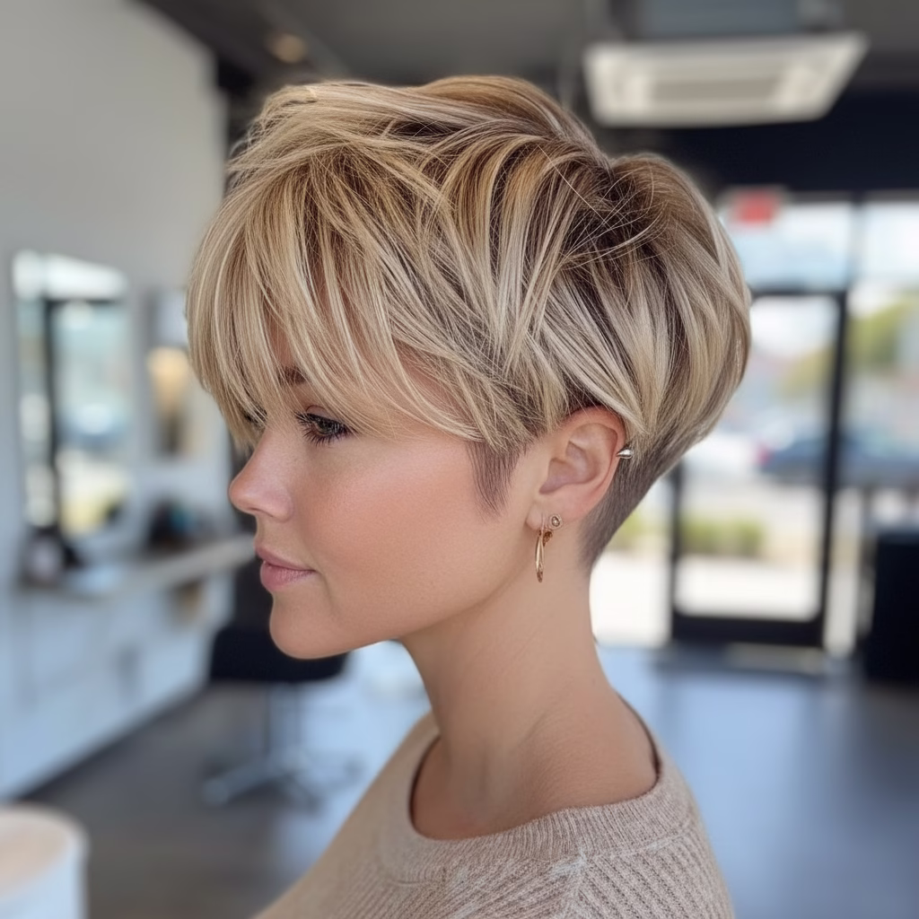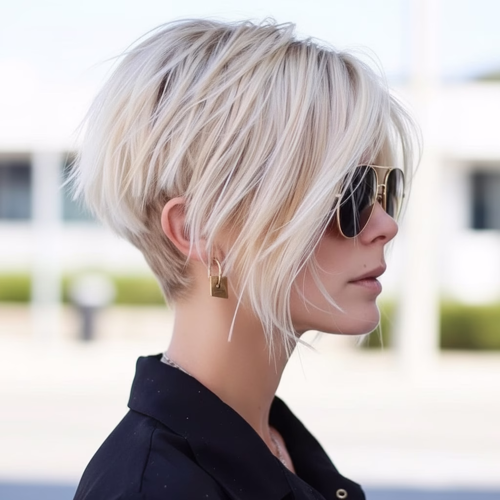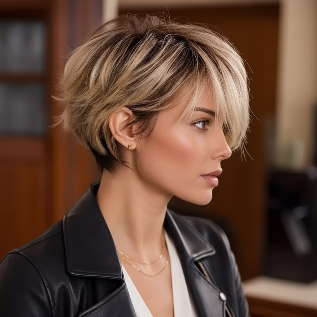 Kurzhaarfrisuren mit blonden Strähnen wirken dadurch nie flach oder eintönig. Stattdessen entsteht ein lebendiger Look, der modern und selbstbewusst wirkt. Genau diese Wirkung macht die Frisur so beliebt – unabhängig von Alter oder Stilrichtung.