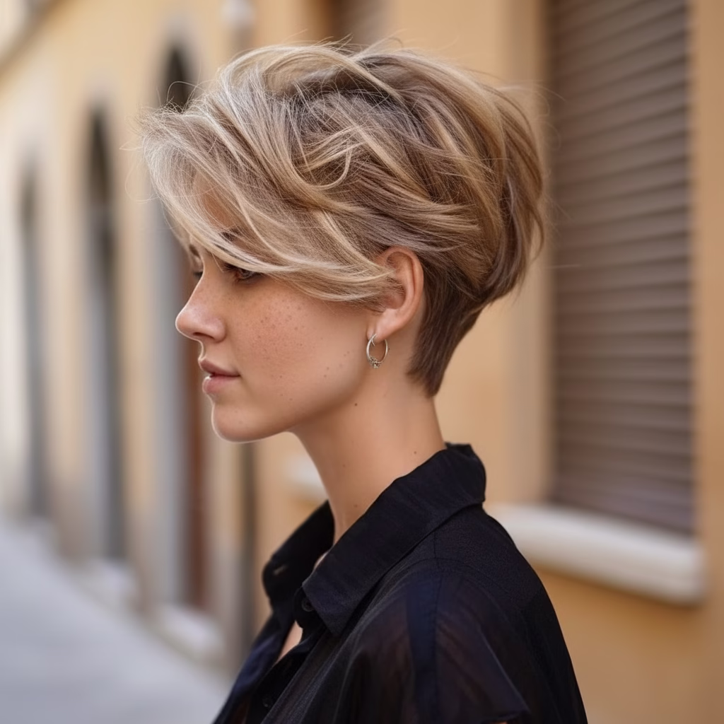 Eine Kurzhaarfrisur mit blonden Strähnen ist immer eine bewusste Entscheidung. Sie steht für Mut, Selbstbewusstsein und Stilgefühl. Die Strähnen setzen Akzente, ohne den Look zu dominieren, und verleihen der Frisur Individualität.