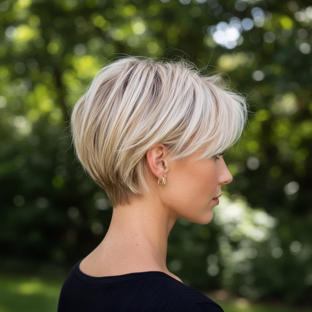 Bei kurzen Frisuren spielen Form und Schnitt eine zentrale Rolle. Blond hebt diese Details hervor, ohne hart zu wirken. Übergänge, Stufen und Silhouetten werden klar erkennbar und verleihen dem Look eine moderne Eleganz.