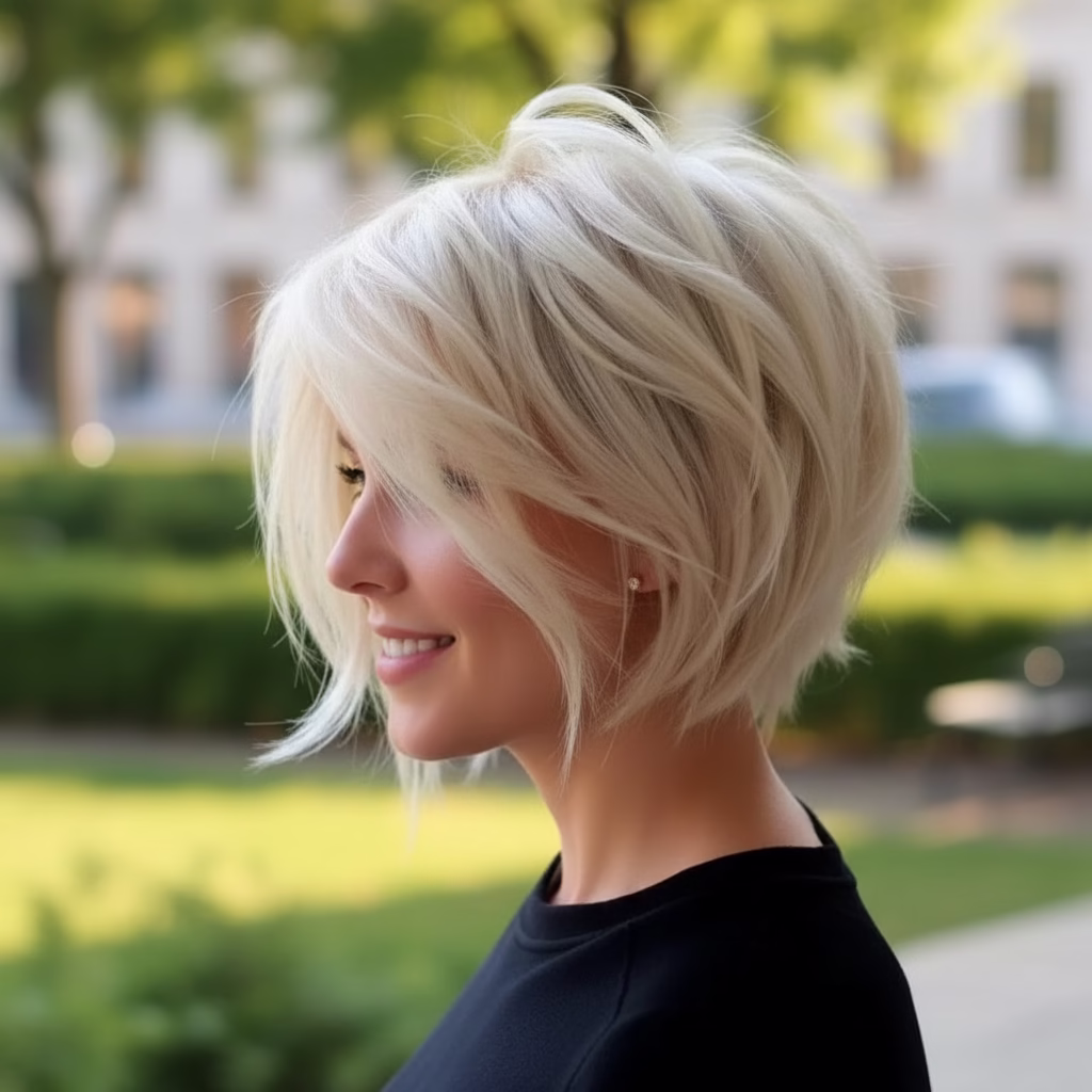 Blond passt sich unterschiedlichen Kurzhaarformen mühelos an. Ob weich gestuft oder klar definiert – die Farbe unterstreicht den Schnitt, ohne ihn zu dominieren. Das Ergebnis ist ein ausgewogenes Gesamtbild.