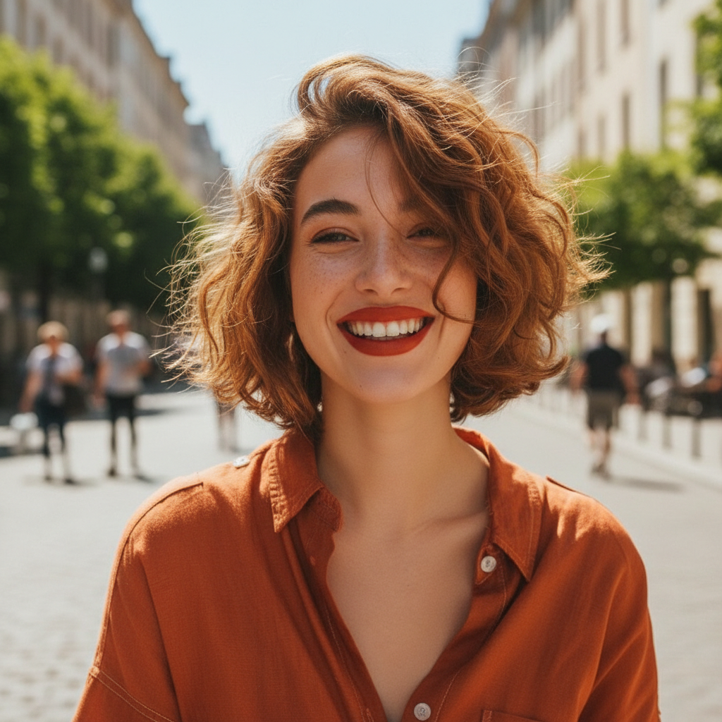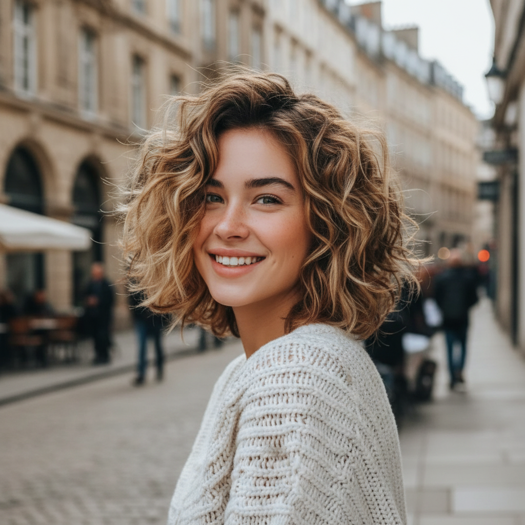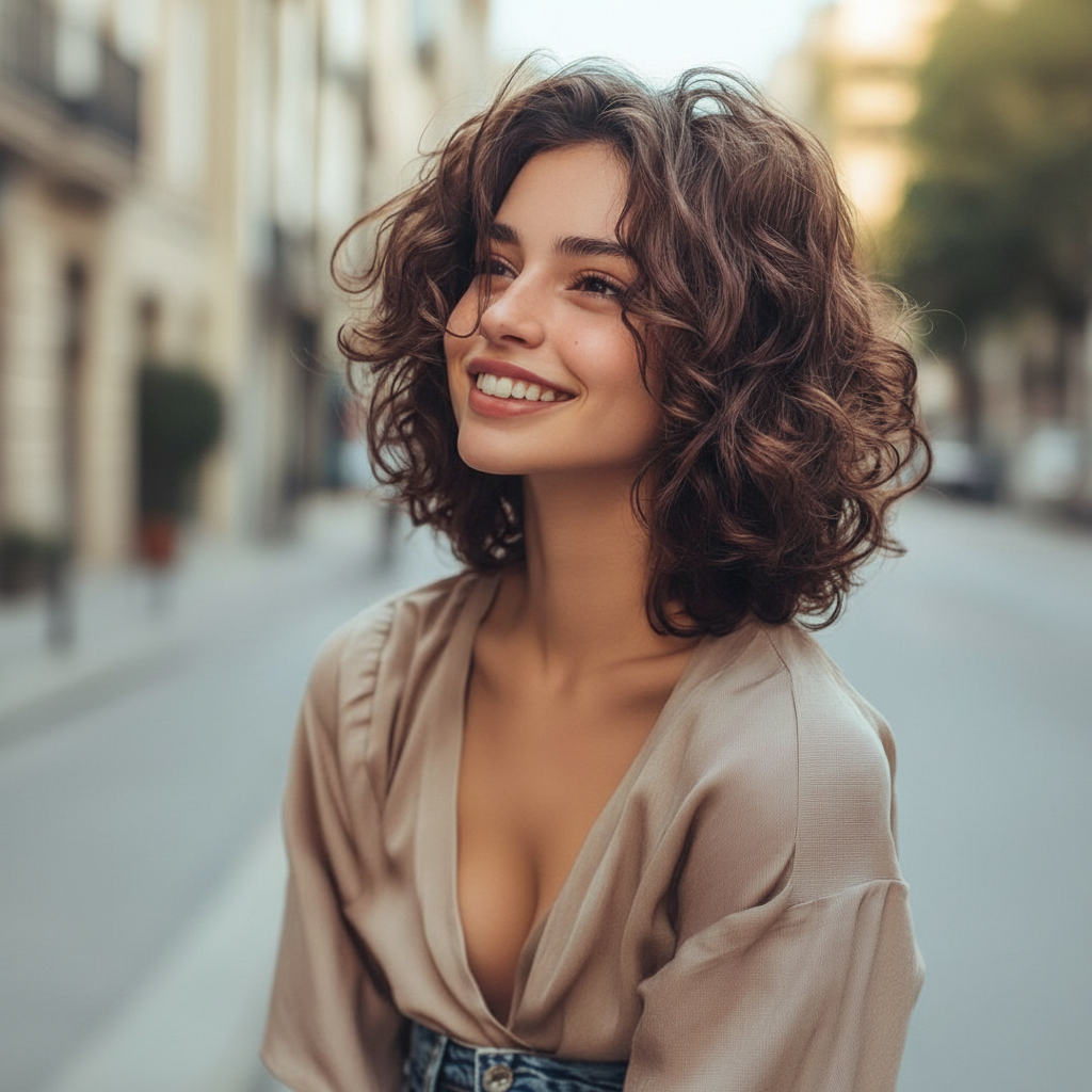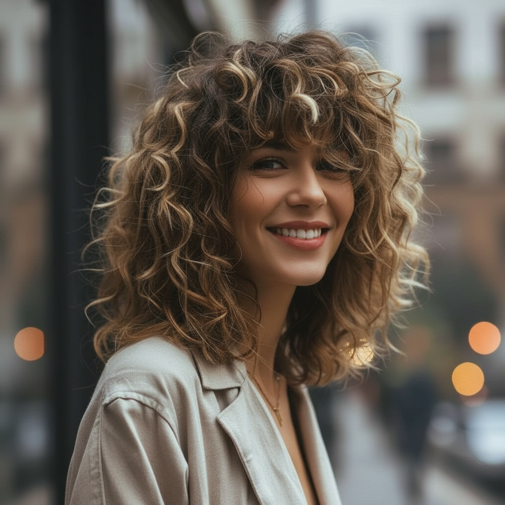Eleganz muss nicht streng sein. Mittellange lockige Frisuren zeigen, dass natürliche Formen ebenso elegant wirken können. Die sanfte Bewegung der Locken verleiht dem Look eine subtile Raffinesse.
