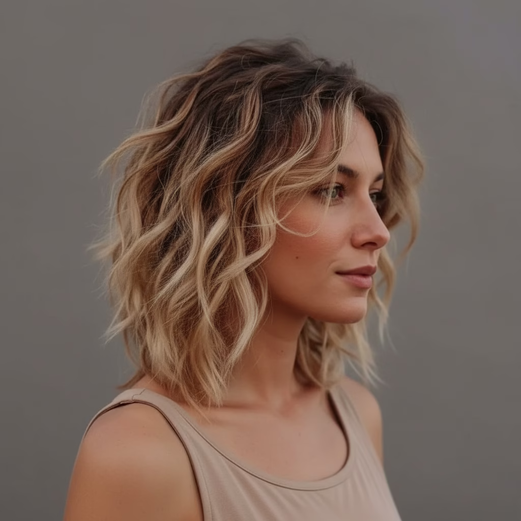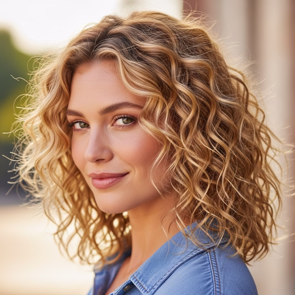 Lockige Haare mittellang blond stehen für Bewegung, Leichtigkeit und zeitlose Schönheit. Sie verbinden natürliche Struktur mit einer ausgewogenen Länge und der strahlenden Wirkung blonder Nuancen.
