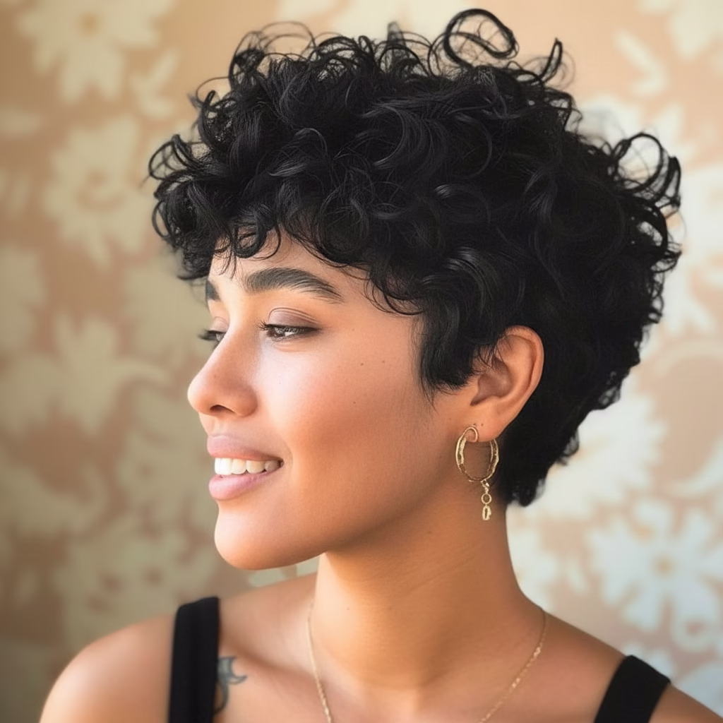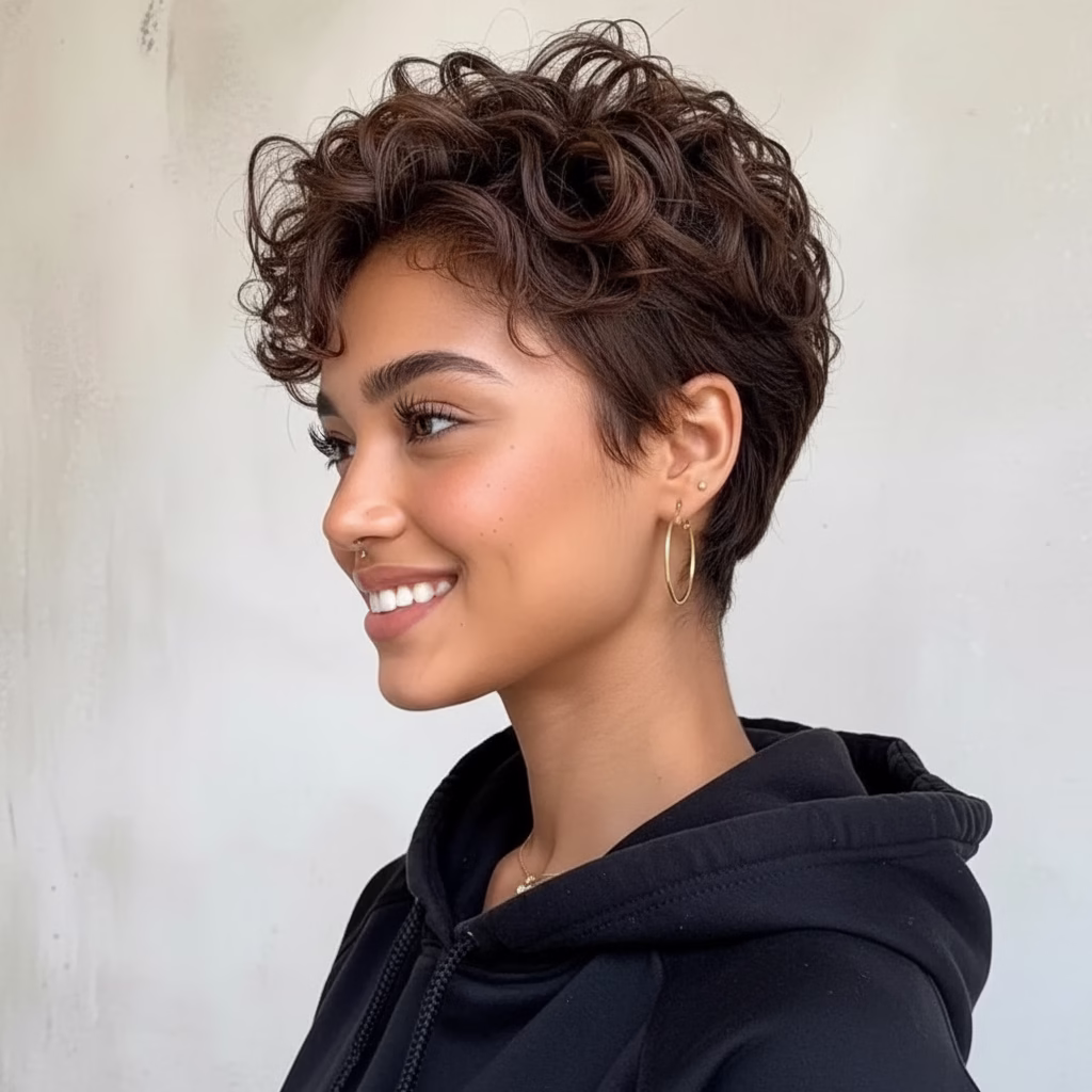 Lockige Pixie Frisuren setzen auf Natürlichkeit. Die Lockenstruktur wird nicht versteckt, sondern bewusst in Szene gesetzt. Dadurch entsteht ein authentischer Look, der modern wirkt und gleichzeitig zeitlos bleibt.
