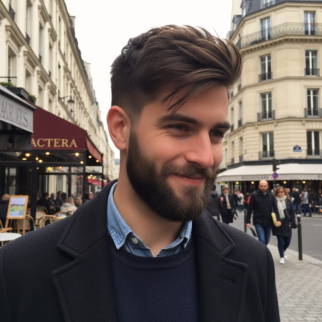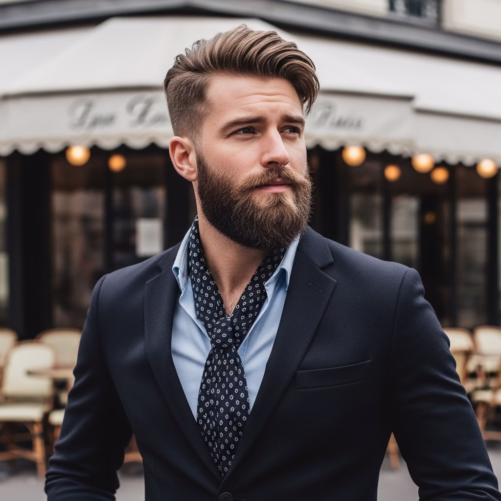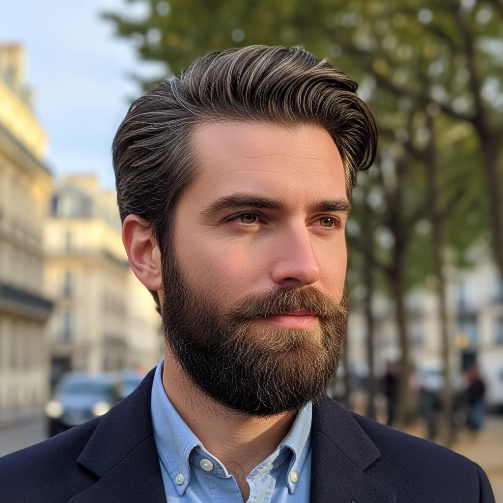 Moderne Männlichkeit ist nicht hart, sondern reflektiert. Frisuren mit Bart zeigen Stärke, ohne grob zu wirken. Der Look vereint Klarheit mit Sensibilität.