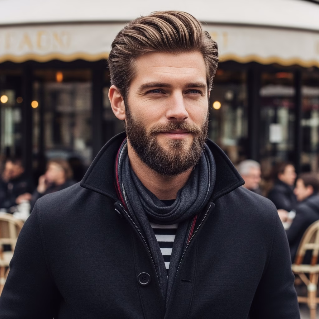Aktuelle Männerlooks setzen auf Zurückhaltung. Weder Frisur noch Bart stehen allein im Mittelpunkt – ihre Wirkung entfaltet sich im Zusammenspiel. Diese Form von Eleganz wirkt unaufgeregt und authentisch.