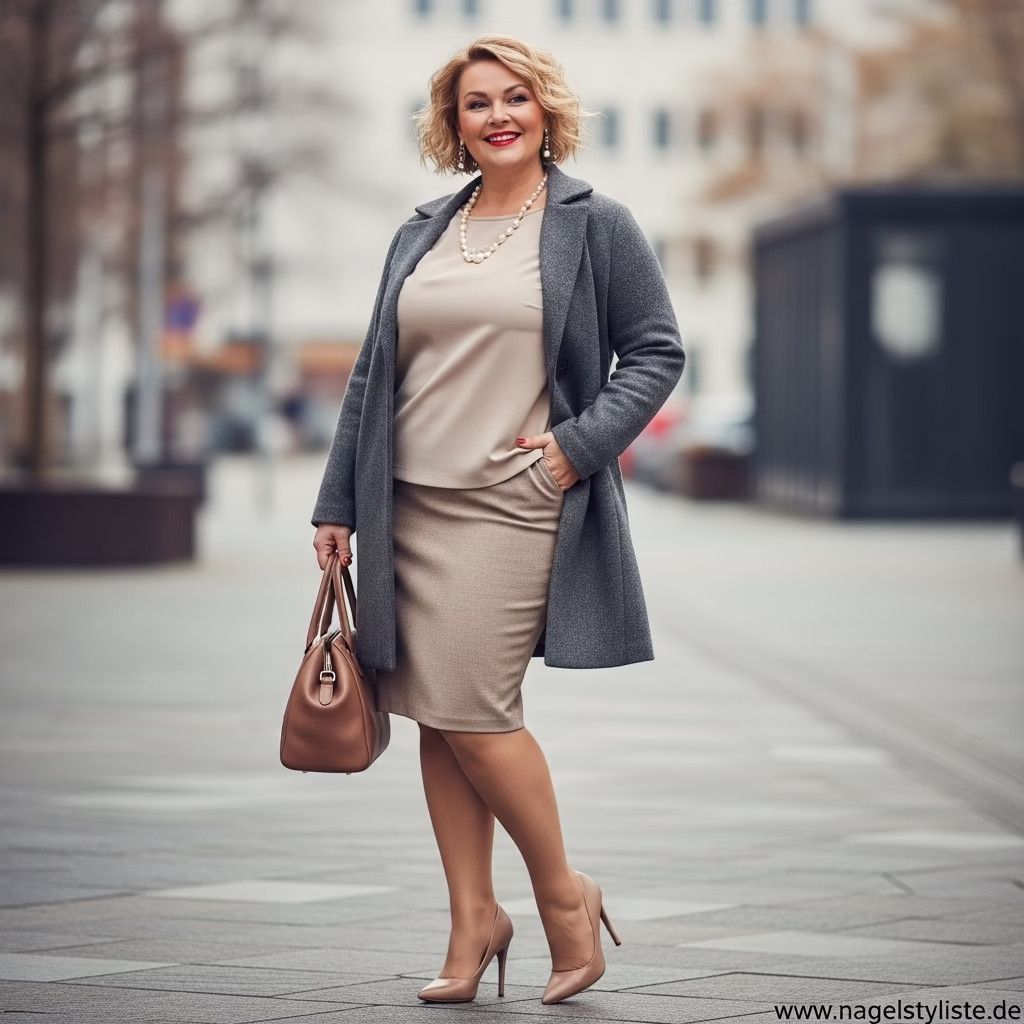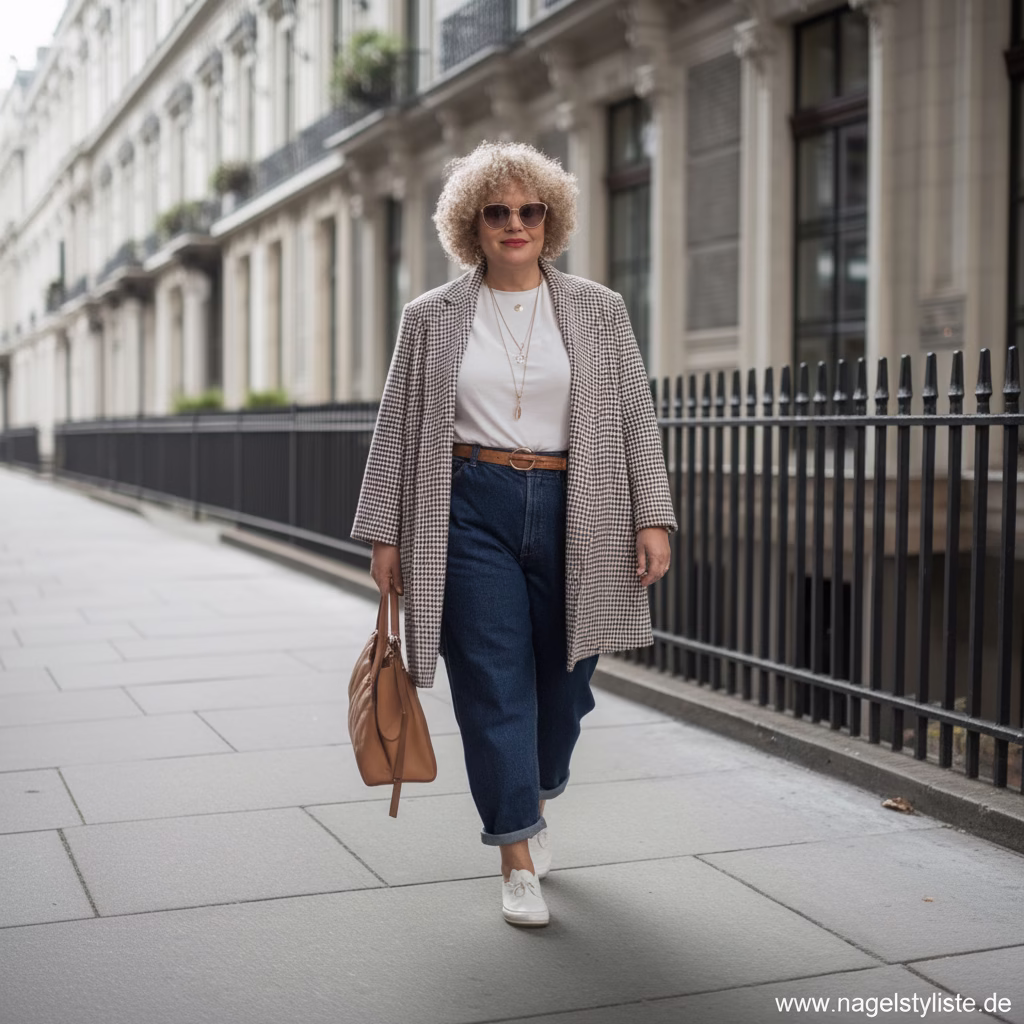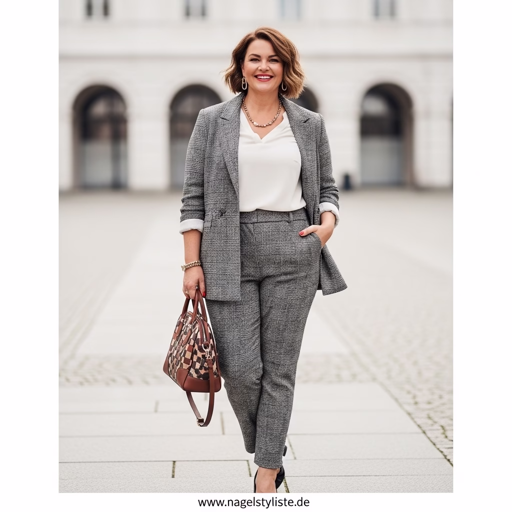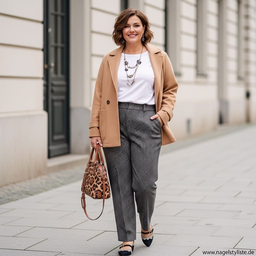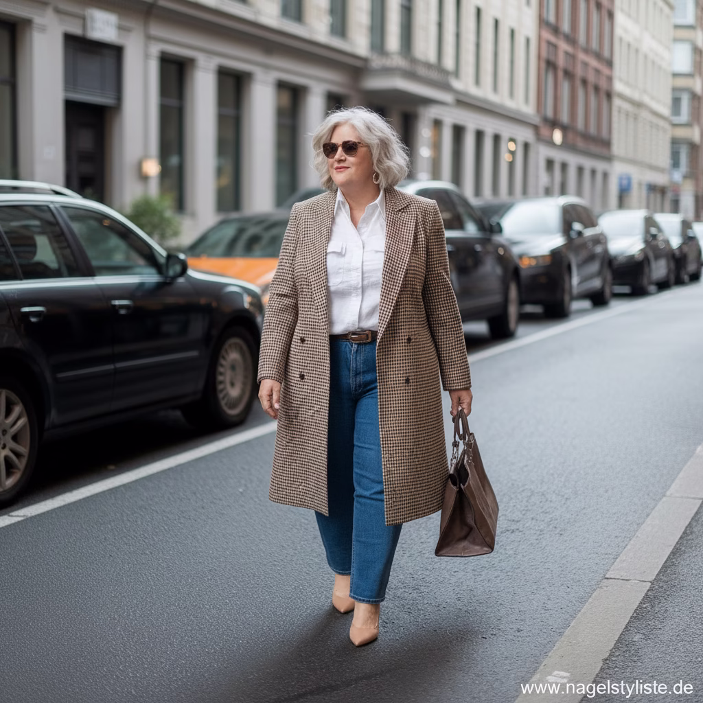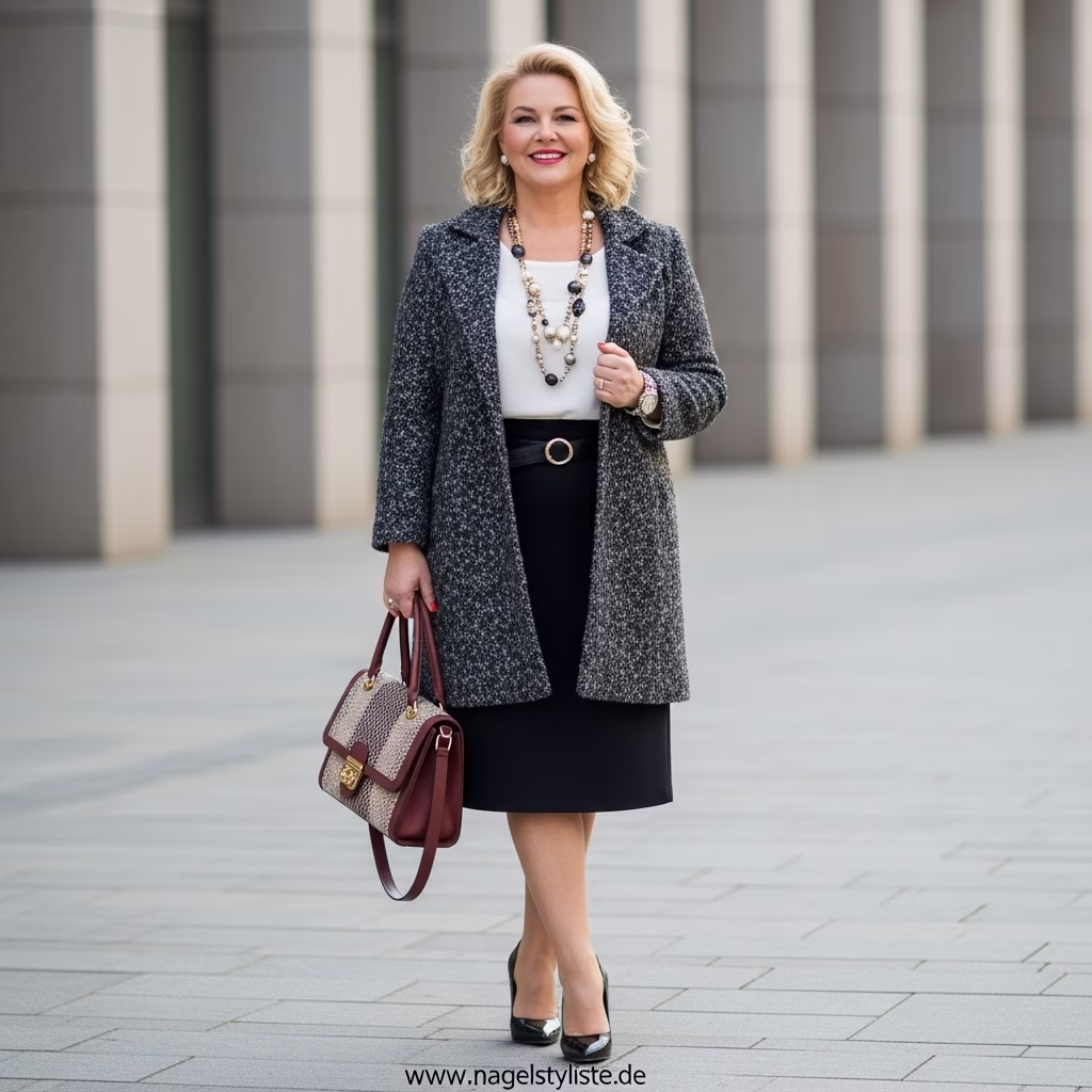 Outfits für mollige Frauen ab 50 setzen auf balancierte Linien, die eine natürliche Struktur schaffen. So entsteht eine elegante Aufwärtsbewegung in der Silhouette, die gleichzeitig modern und schmeichelhaft wirkt.