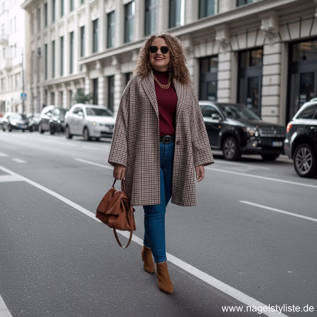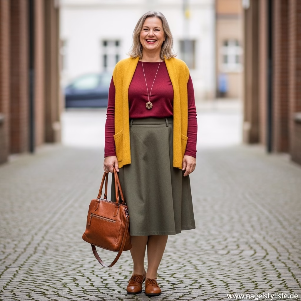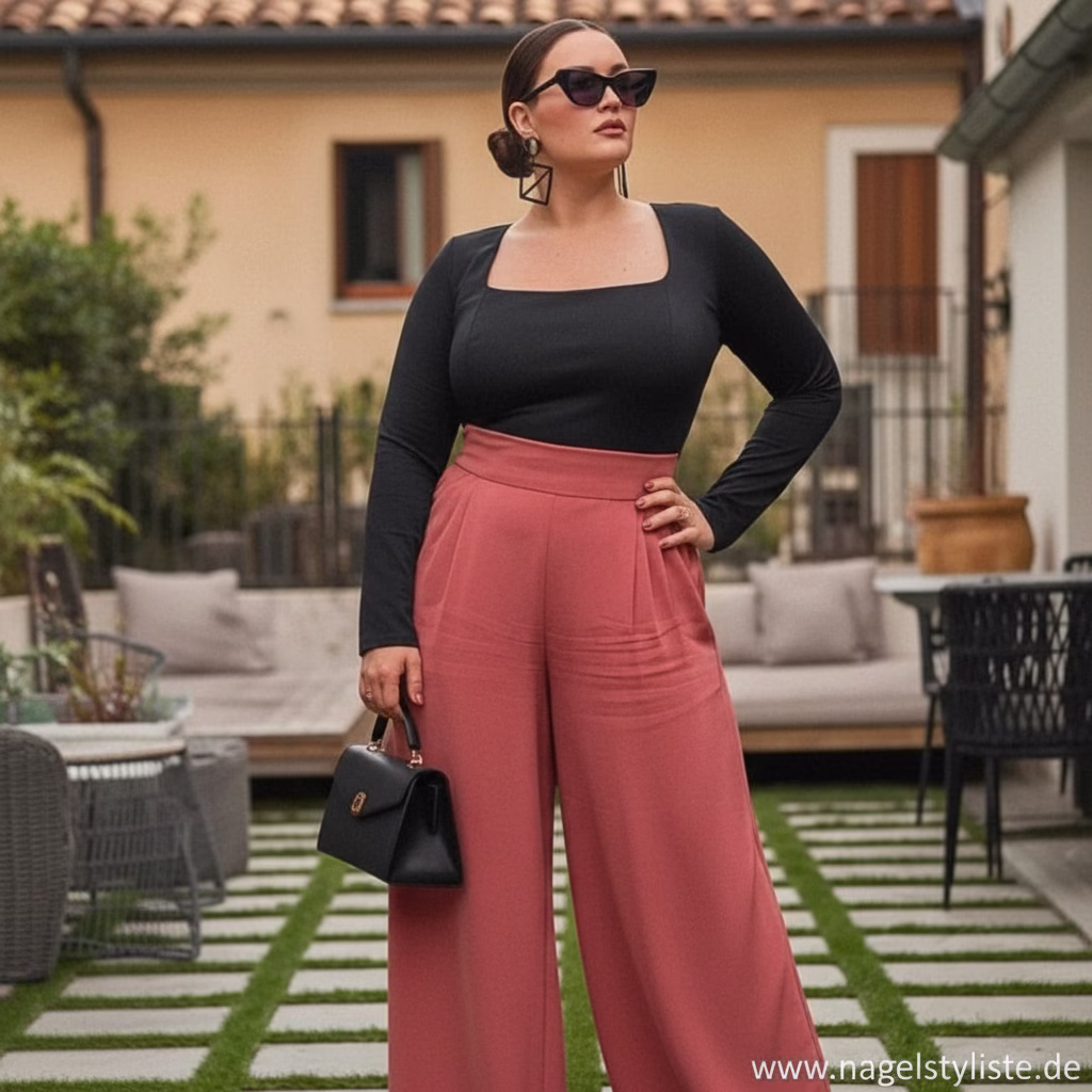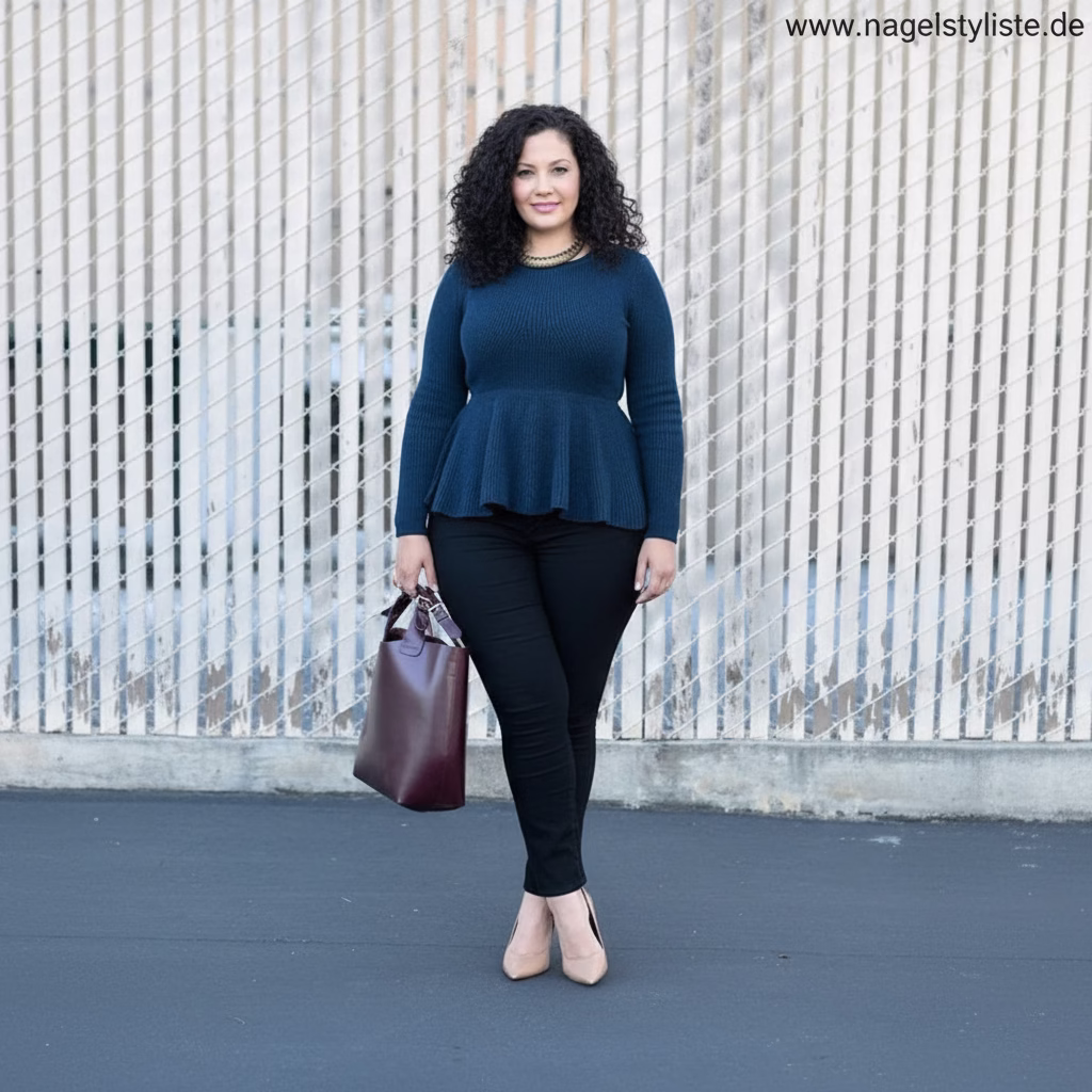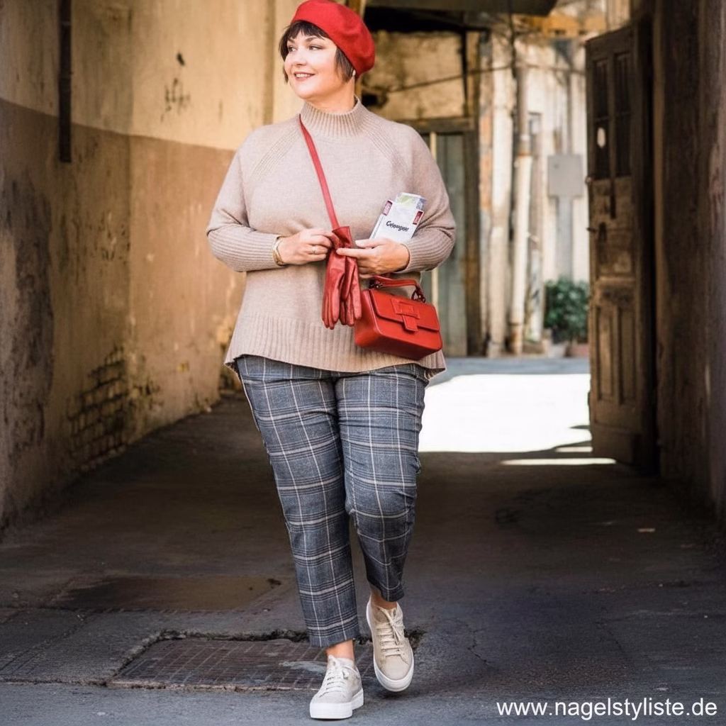Outfits für mollige Frauen ab 50 setzen auf balancierte Linien, die eine natürliche Struktur schaffen. So entsteht eine elegante Aufwärtsbewegung in der Silhouette, die gleichzeitig modern und schmeichelhaft wirkt.