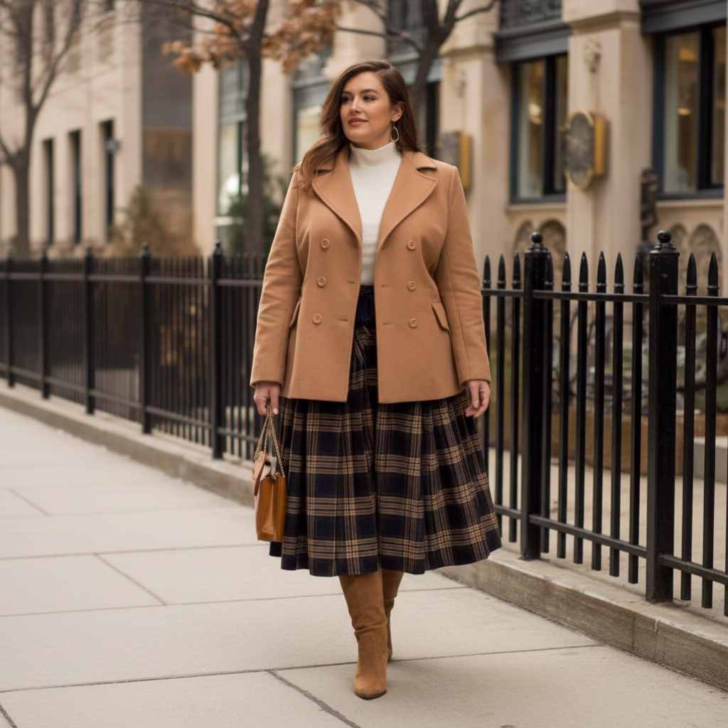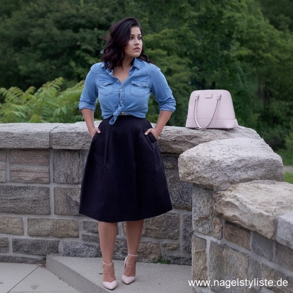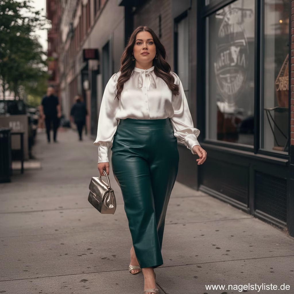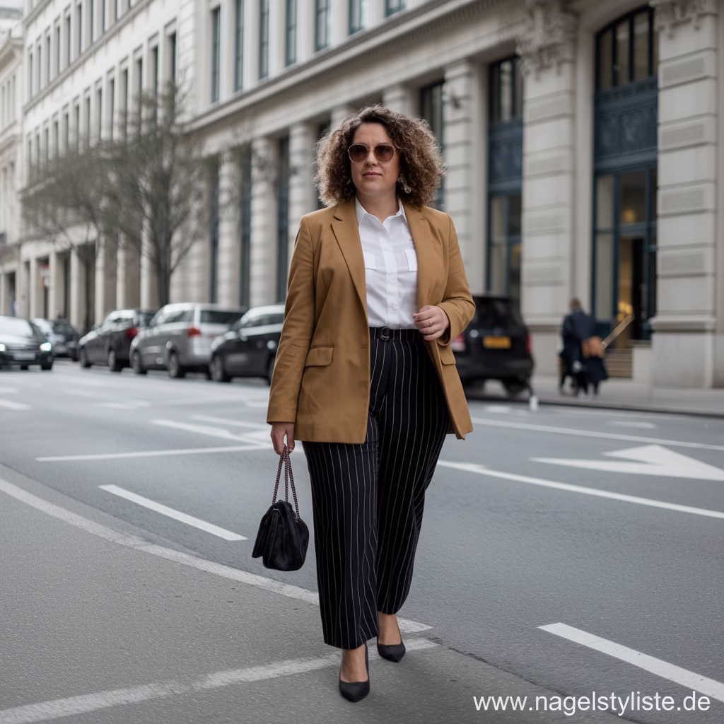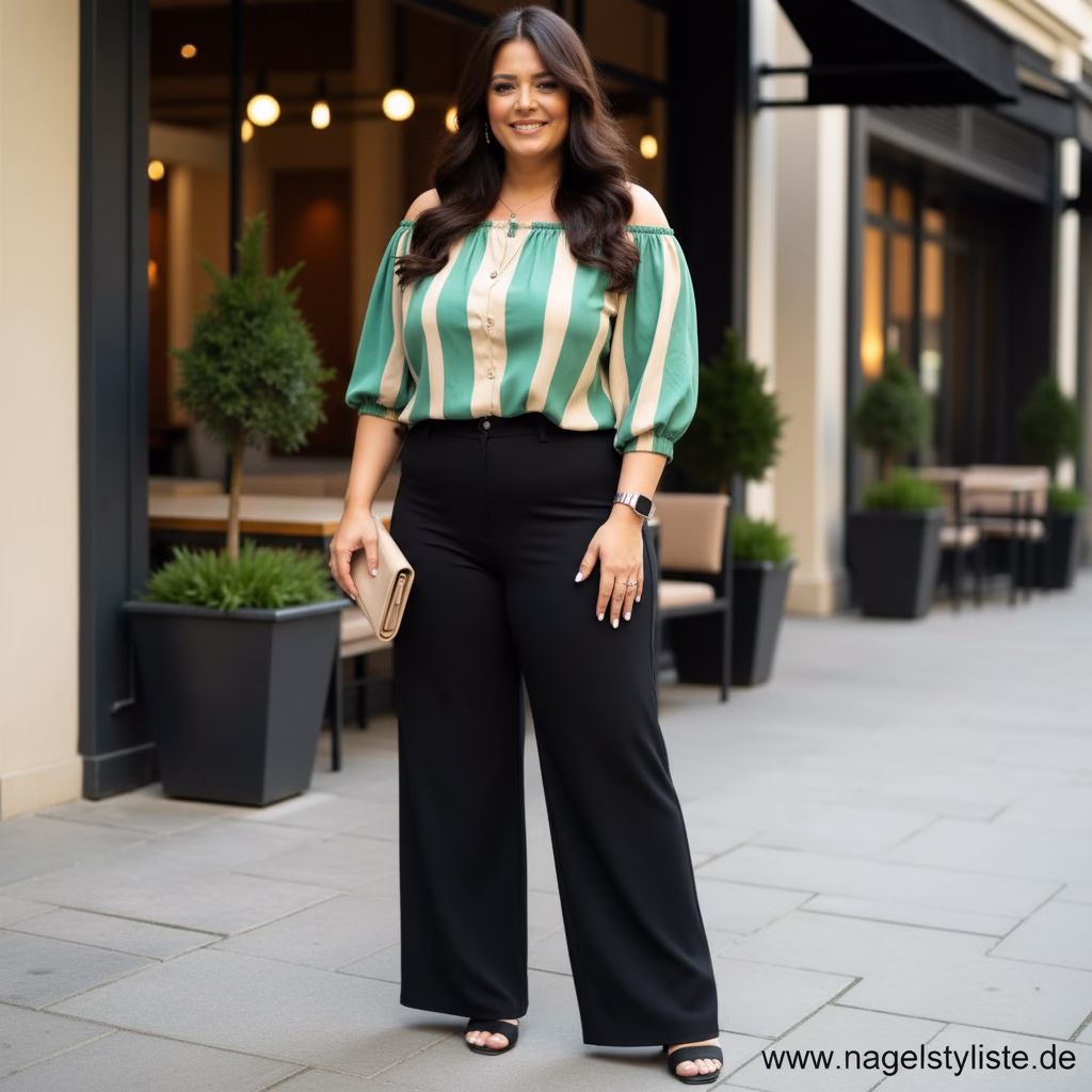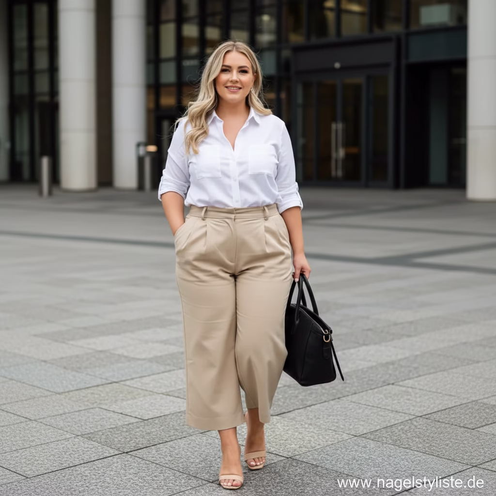 Outfits für mollige Frauen ab 50 setzen auf balancierte Linien, die eine natürliche Struktur schaffen. So entsteht eine elegante Aufwärtsbewegung in der Silhouette, die gleichzeitig modern und schmeichelhaft wirkt.