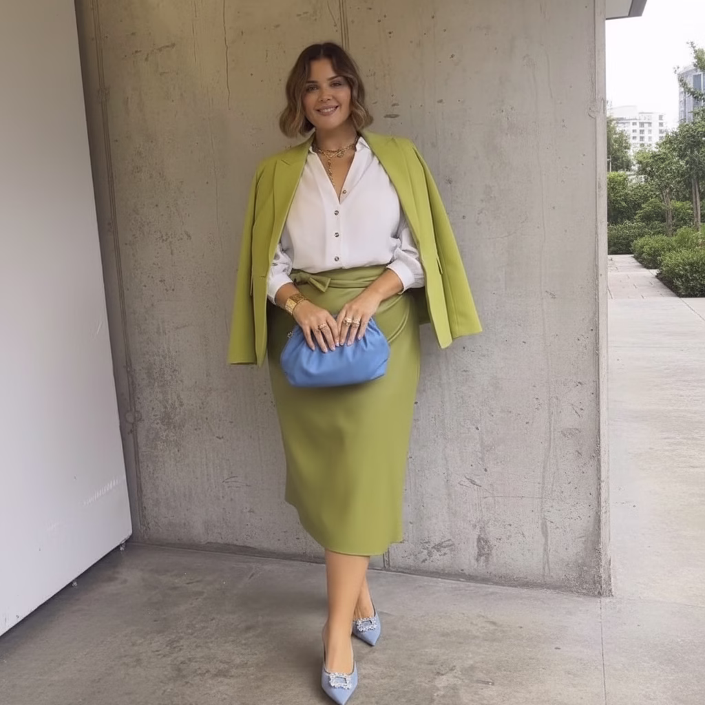 Warme Neutraltöne wie Creme, Sand, Zimt oder Taupe schenken dem Look eine sanfte Eleganz. Tiefere Nuancen wie Smaragd, Nachtblau oder Bordeaux stehen für Stärke und Klasse. Monochrome Sets wirken edel und strecken die Figur, ohne aufzutragen.