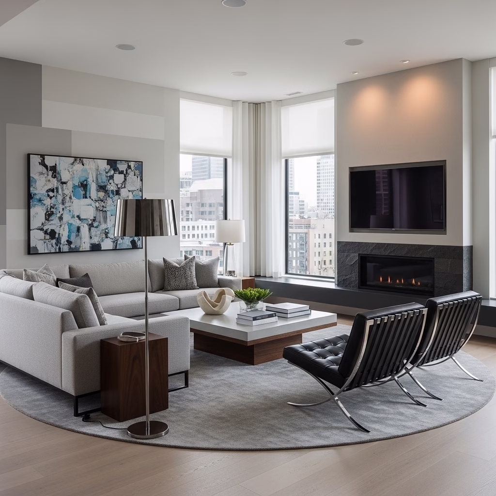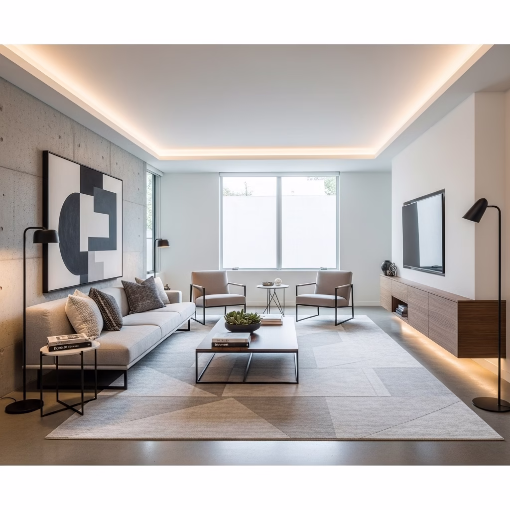 Geradlinigkeit ist ein zentrales Merkmal moderner Wohnzimmer. Möbel, Wandflächen und Raumaufteilungen folgen einer klaren Ordnung. Diese Struktur sorgt für visuelle Ruhe und lässt den Raum großzügig wirken – unabhängig von seiner tatsächlichen Größe.