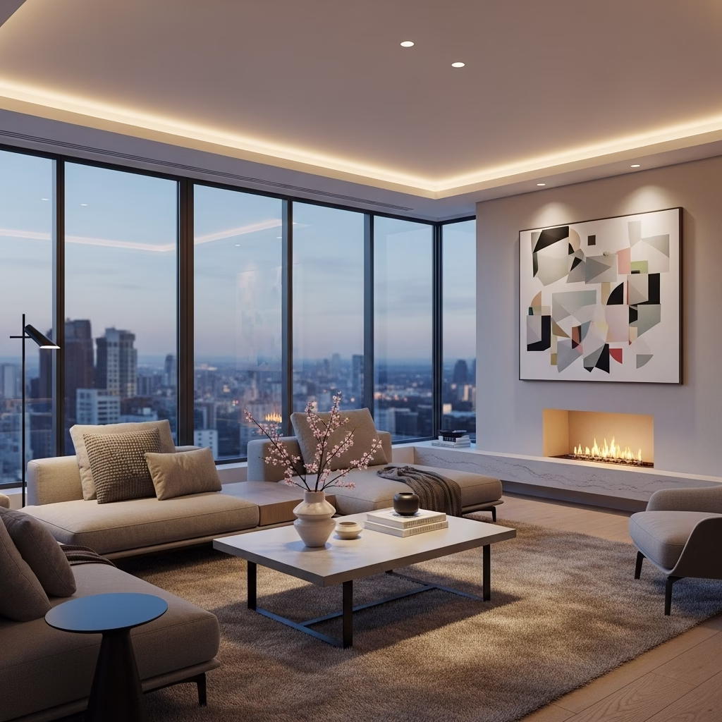 Moderne Inneneinrichtung im Wohnzimmer verbindet Klarheit, Funktionalität und Persönlichkeit zu einem harmonischen Gesamtbild. Durch bewusste Reduktion, hochwertige Materialien und ruhige Gestaltung entsteht ein Raum, der zeitgemäß und zugleich zeitlos wirkt. Das Wohnzimmer wird zum Ort des Ankommens, der Ruhe und des bewussten Wohnens.