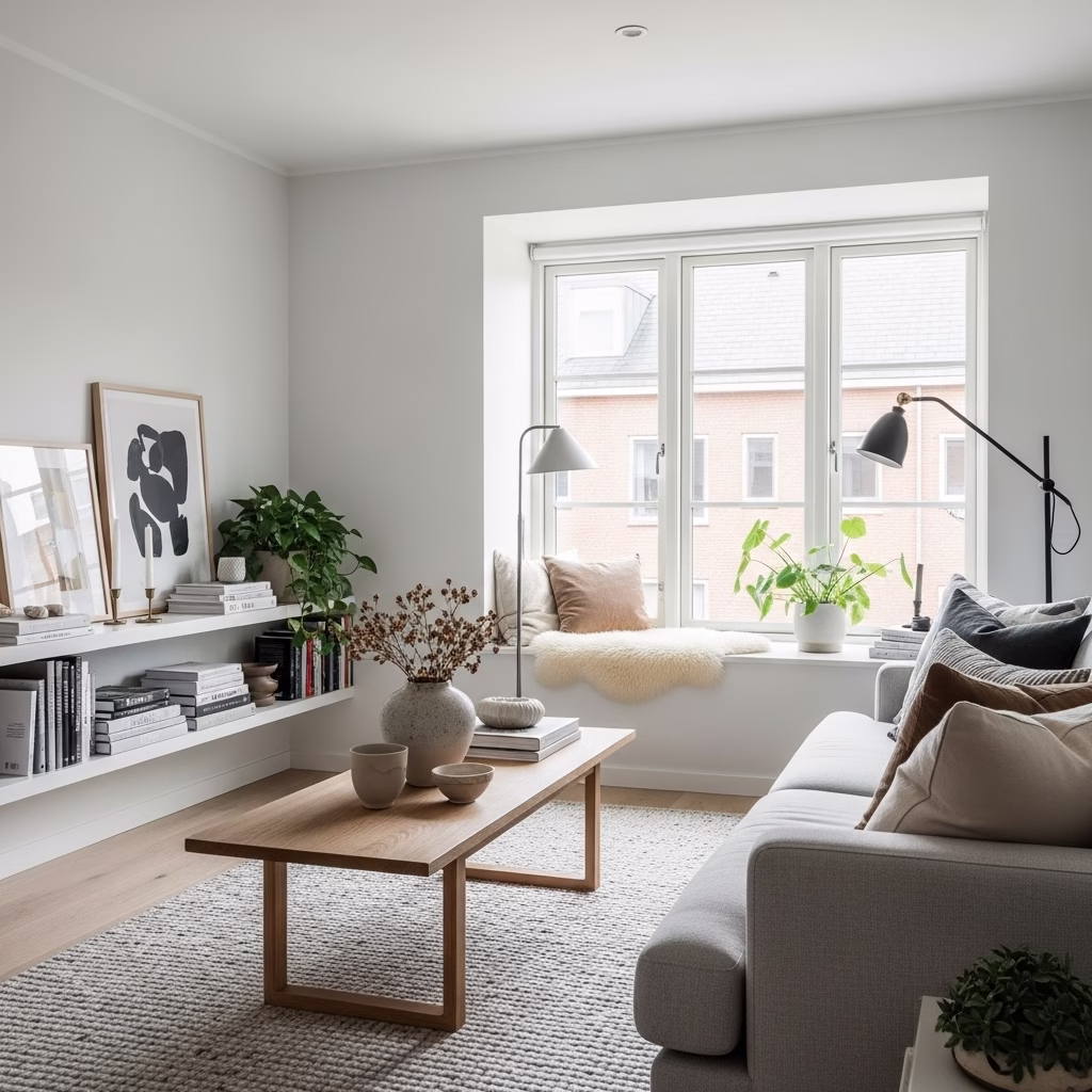 Klare Linien, ruhige Farben und eine ausgewogene Raumgestaltung.