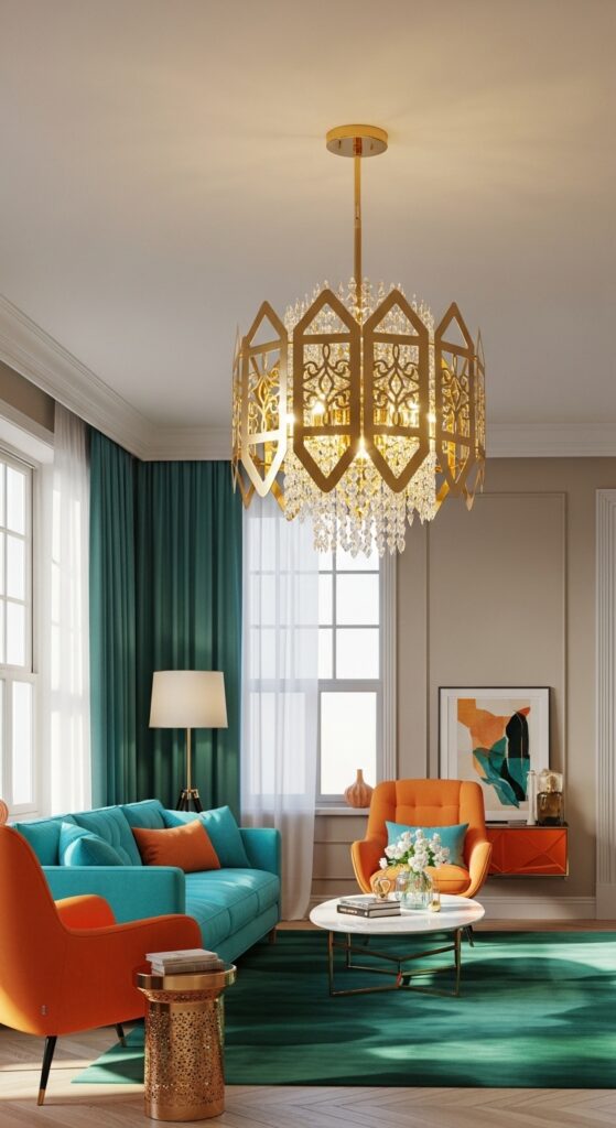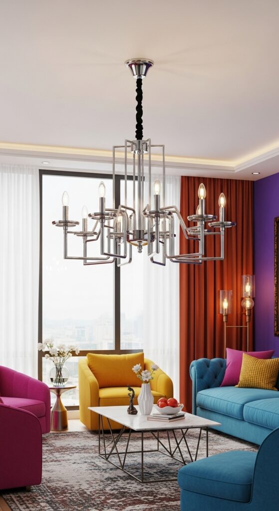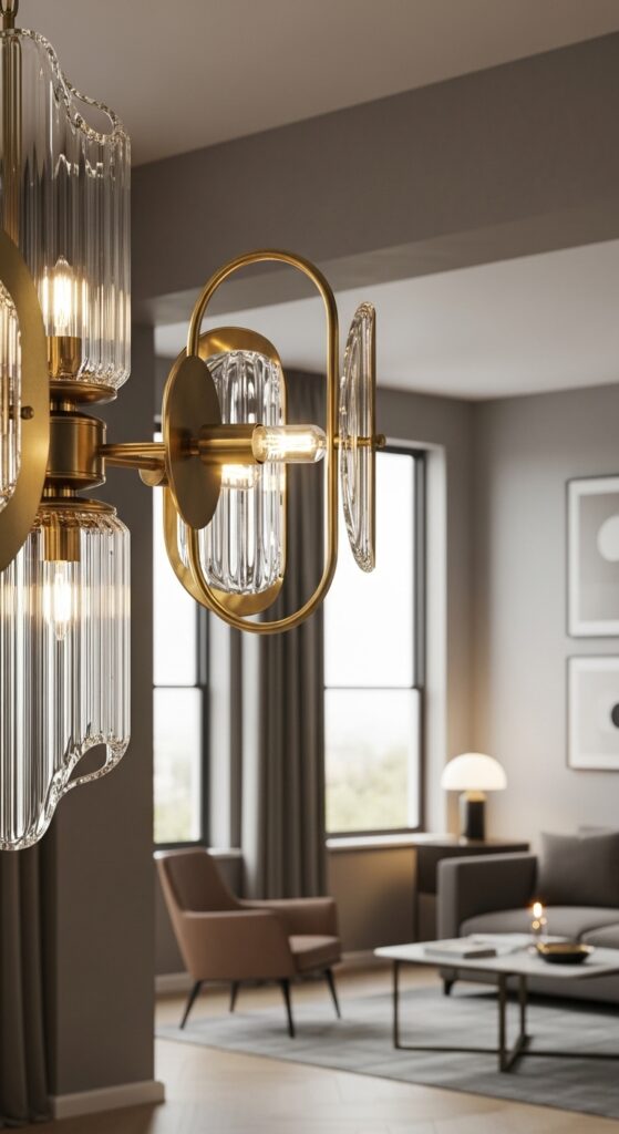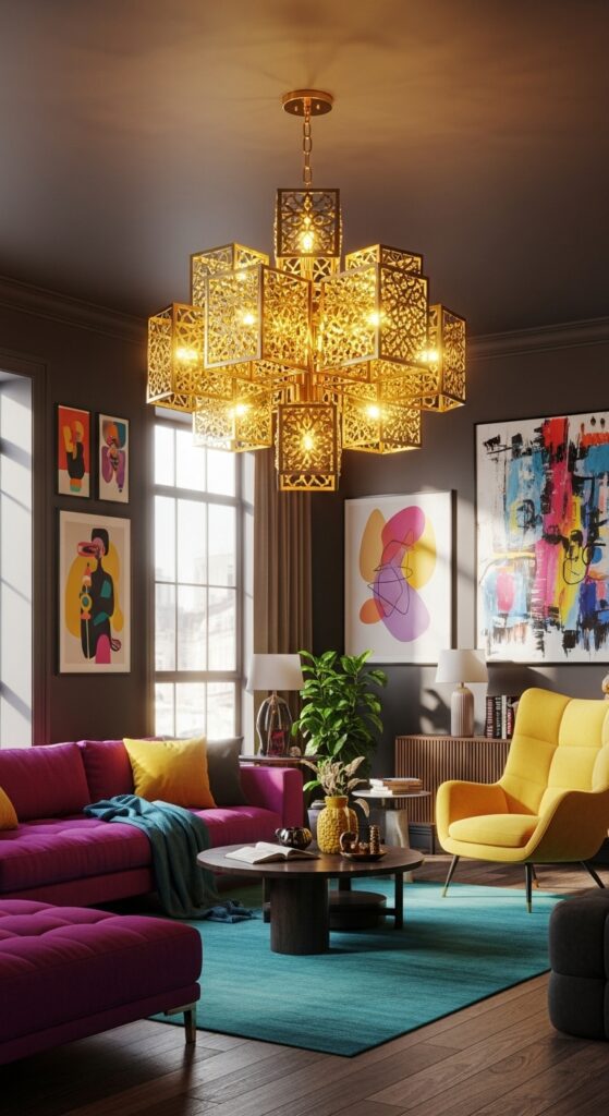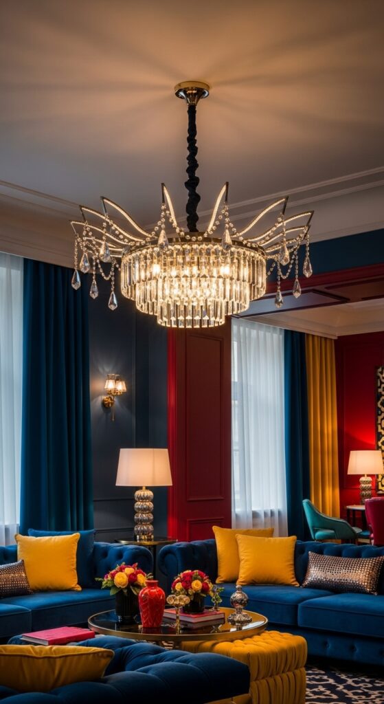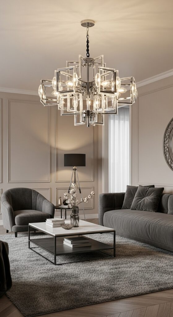 Ein moderner Kronleuchter lässt sich auch wunderbar mit anderen Leuchten kombinieren – etwa mit Wandlampen oder Stehleuchten im gleichen Stil 🕯️.