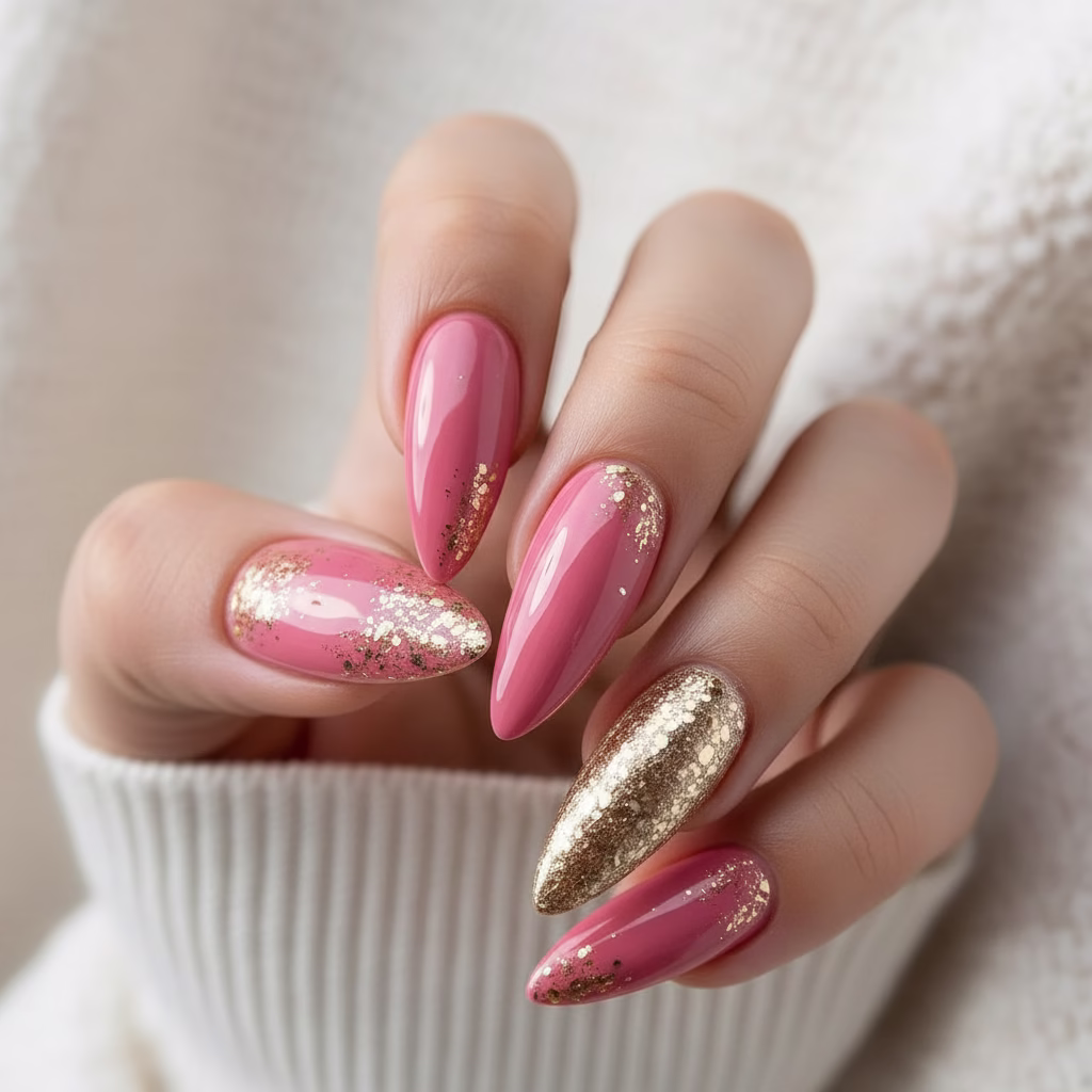 Rosa-goldene Nägel stehen für eine besonders elegante Form moderner Nail-Ästhetik. Die Kombination aus zartem Rosé und warmem Goldton erzeugt eine harmonische Balance zwischen Zurückhaltung und luxuriösem Glanz. Der Look wirkt weich, feminin und zugleich stilvoll inszeniert.