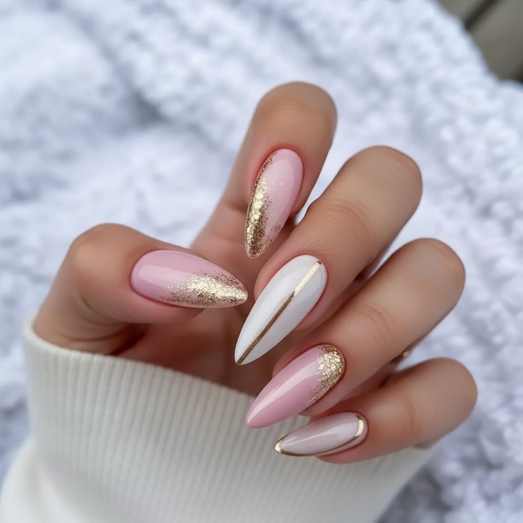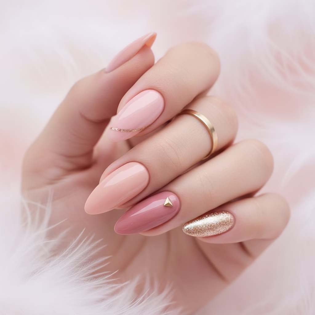 Rosa-goldene Nägel kombinieren zarte Rosétöne mit warmem Goldglanz für eine elegante Optik.