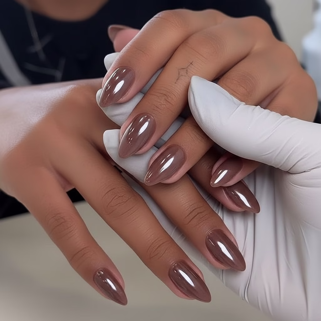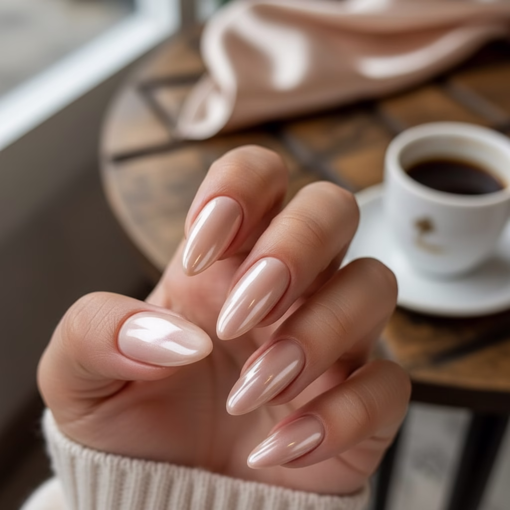 Nude Nägel mit Chrome-Effekt verändern die Ausstrahlung der Hände deutlich. Sie wirken gepflegt, modern und hochwertig. Der leichte Spiegeleffekt zieht Blicke an, bleibt dabei aber stets zurückhaltend.