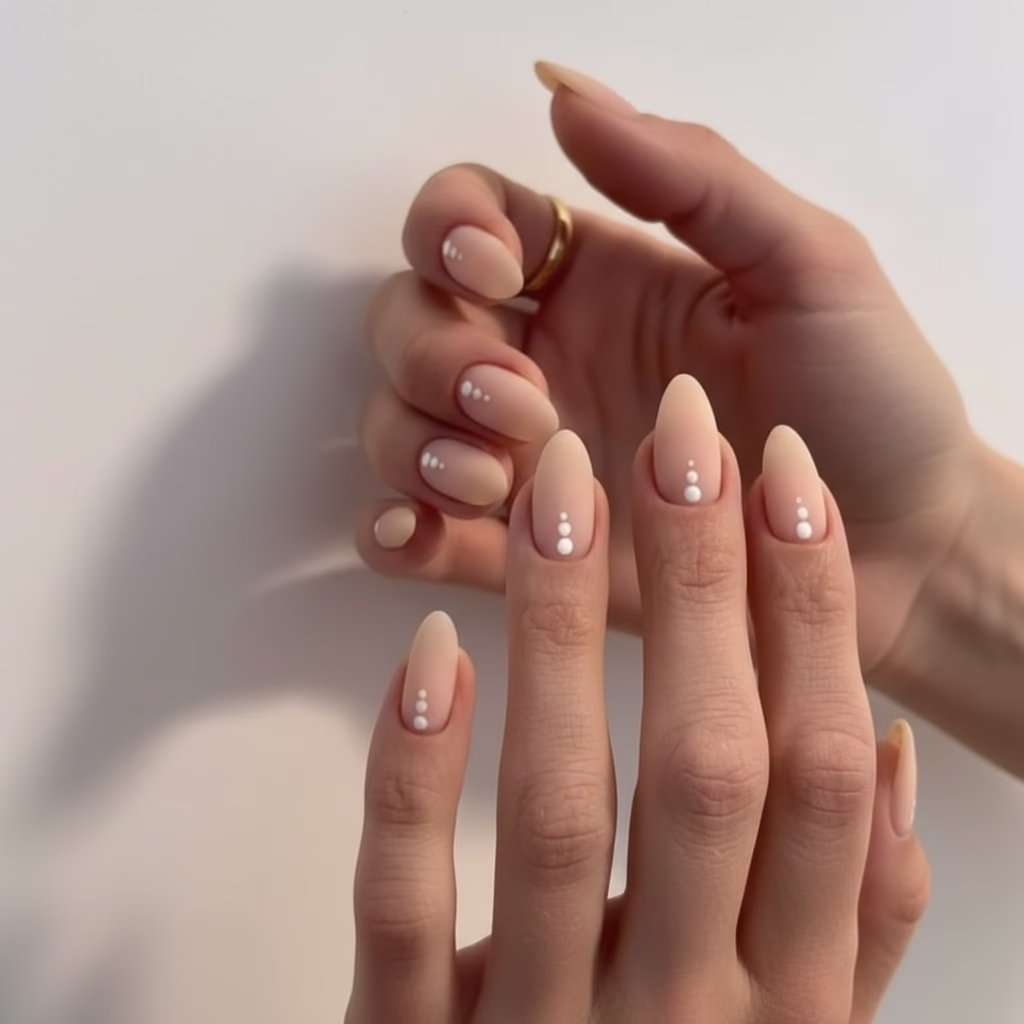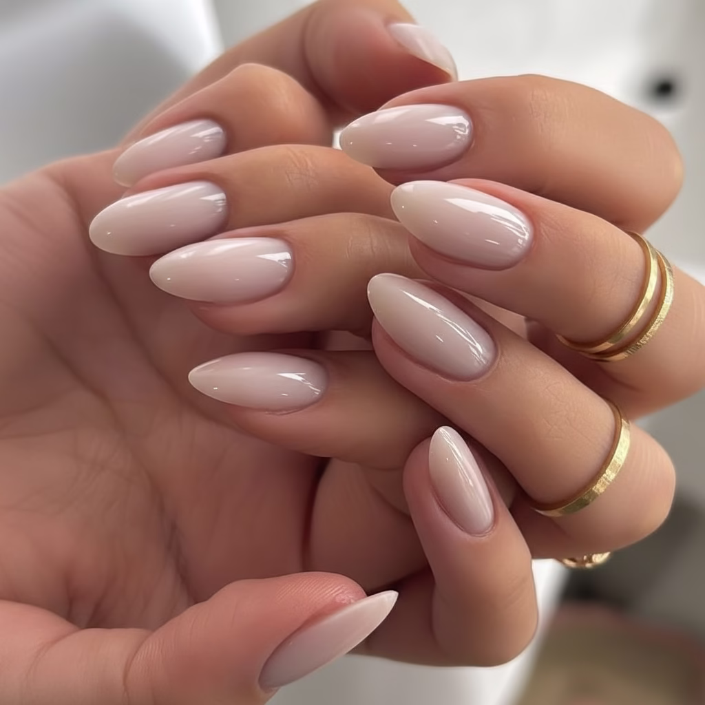 Die Stärke dieses Looks liegt im Zusammenspiel von ovaler Form und zurückhaltender Farbgebung. Die weichen Linien der Nagelform werden durch die sanften Nude-Töne zusätzlich betont.