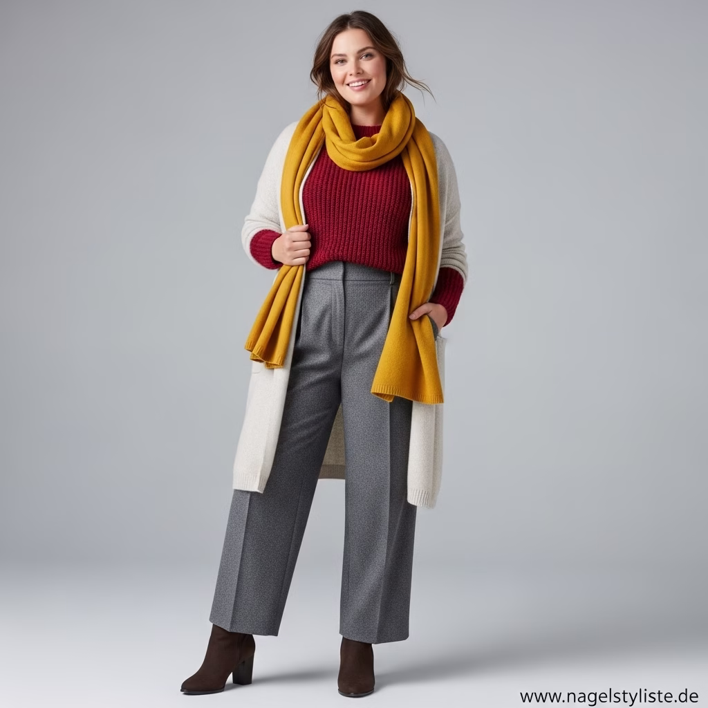 Winterfarben müssen nicht dunkel sein. Warme Naturtöne, sanfte Erdfarben und tiefe Nuancen verleihen Plus-Size-Outfits im Winter eine einladende Ausstrahlung. Farbkonzepte wirken besonders harmonisch, wenn sie das Gesamtbild unterstützen, statt zu dominieren.