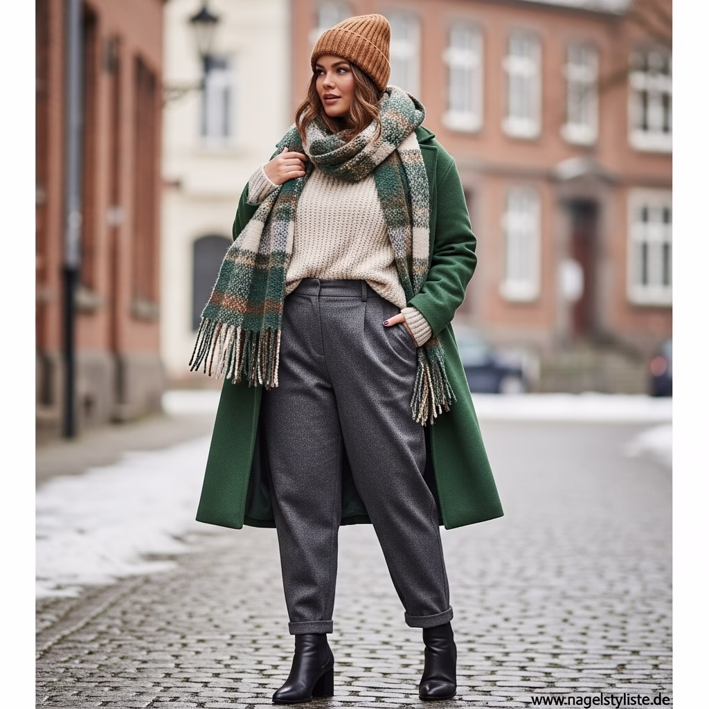 Winterliche Outfits für Plus-Size-Damen leben von Balance. Volumen und Struktur stehen in einem ausgewogenen Verhältnis. Fließende Stoffe treffen auf klare Linien, weiche Texturen auf definierte Formen. Diese Harmonie sorgt für einen ruhigen, eleganten Look.