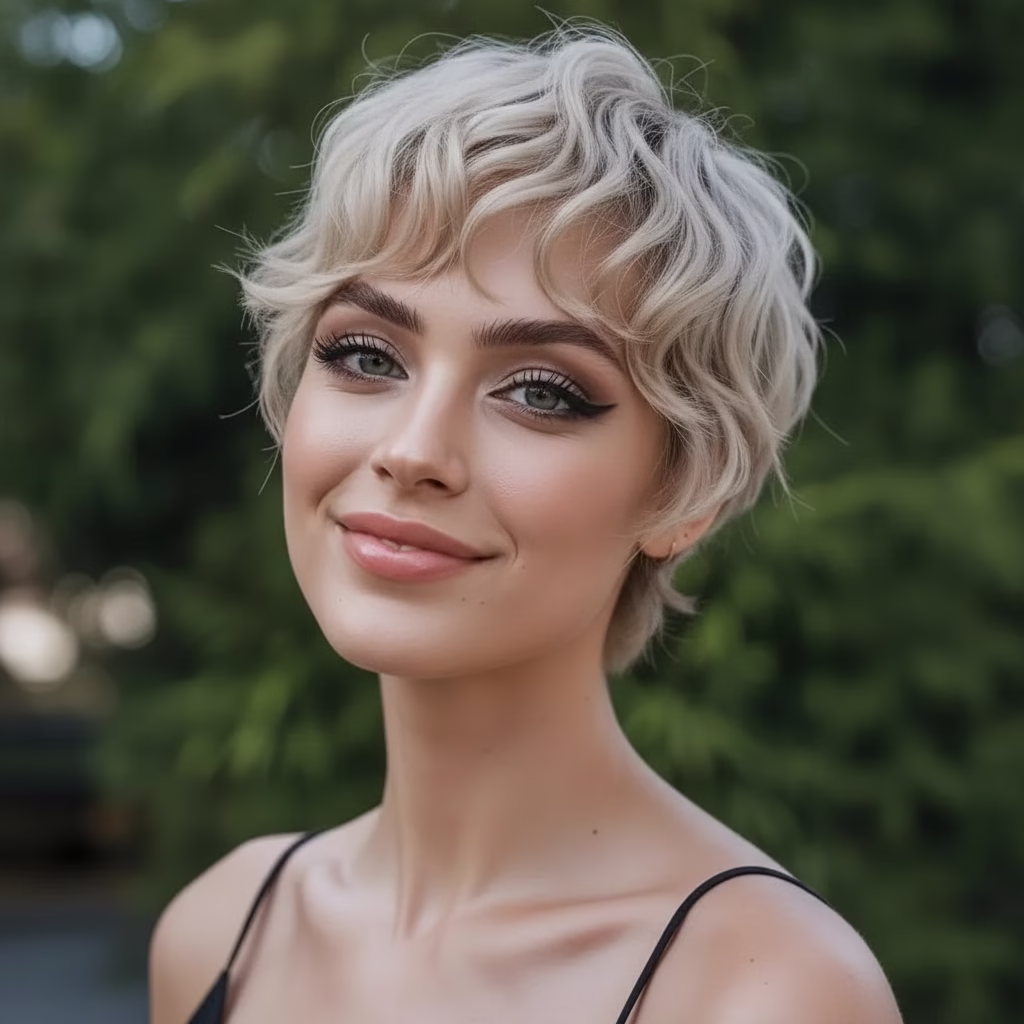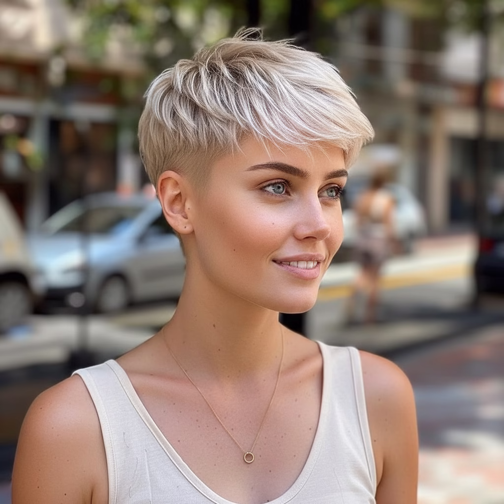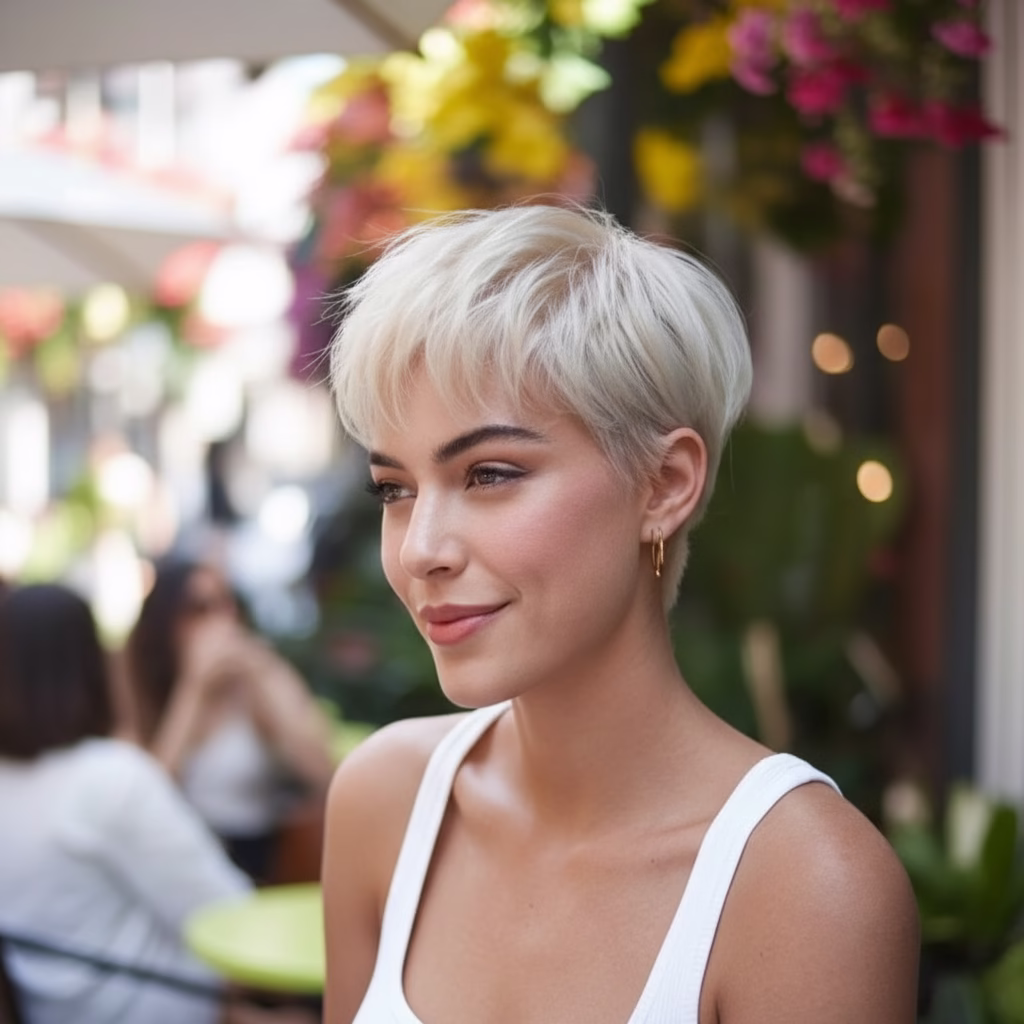 Der blonde Pixie Cut zeigt, dass Femininität viele Facetten hat. Sie kann minimalistisch, stark und selbstbestimmt sein. Kurze Haare und helle Farbe schaffen einen Look, der bewusst auf klassische Schönheitsklischees verzichtet und dennoch ausgesprochen feminin wirkt.