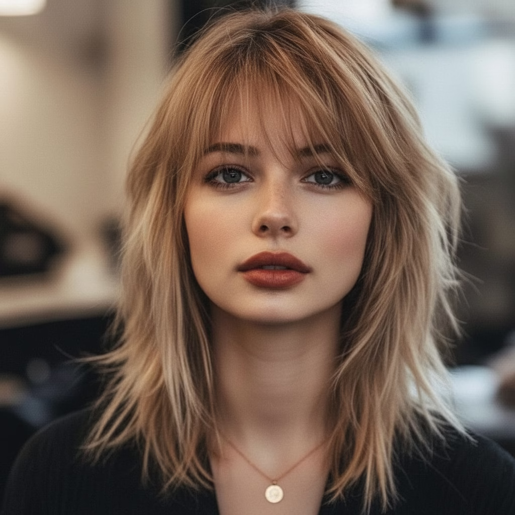 Ein Pony verändert die Ausstrahlung einer Frisur maßgeblich. Bei mittellangen Haaren entsteht dabei ein harmonisches Zusammenspiel aus Länge und Struktur. Der Pony lenkt den Blick auf die Gesichtspartie, während die restlichen Haare für Bewegung und Leichtigkeit sorgen.