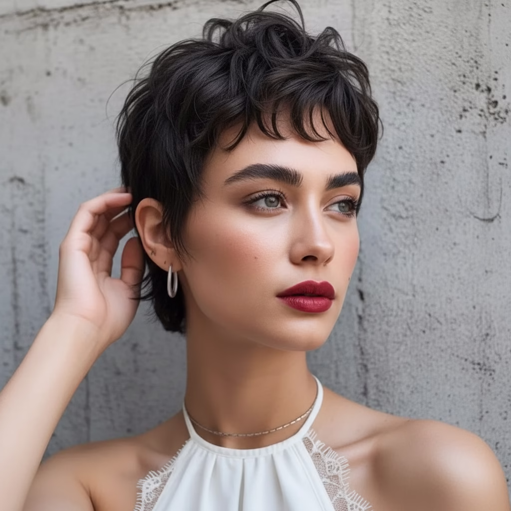 Moderne schwarze Kurzhaarfrisuren für Damen zeichnen sich durch klare Linien, weiche Stufen und natürliche Bewegung aus. Besonders beliebt sind Pixie Cuts, kurze Bobs und sanft gestufte Kurzhaarschnitte mit femininer Kontur.