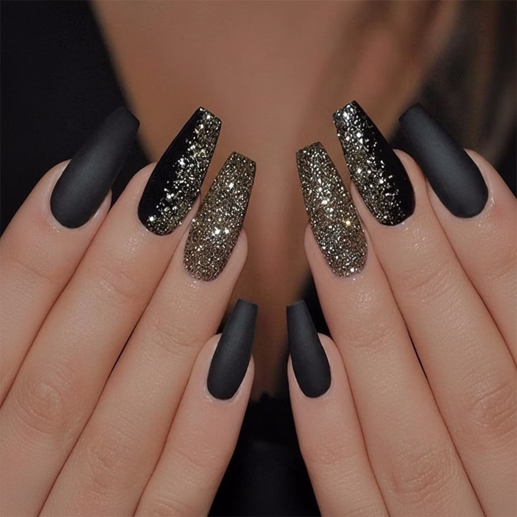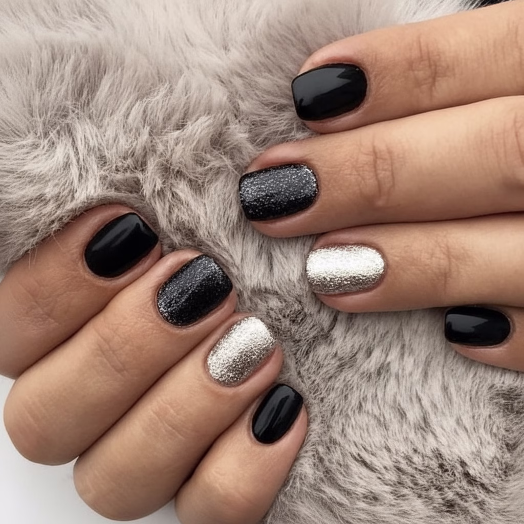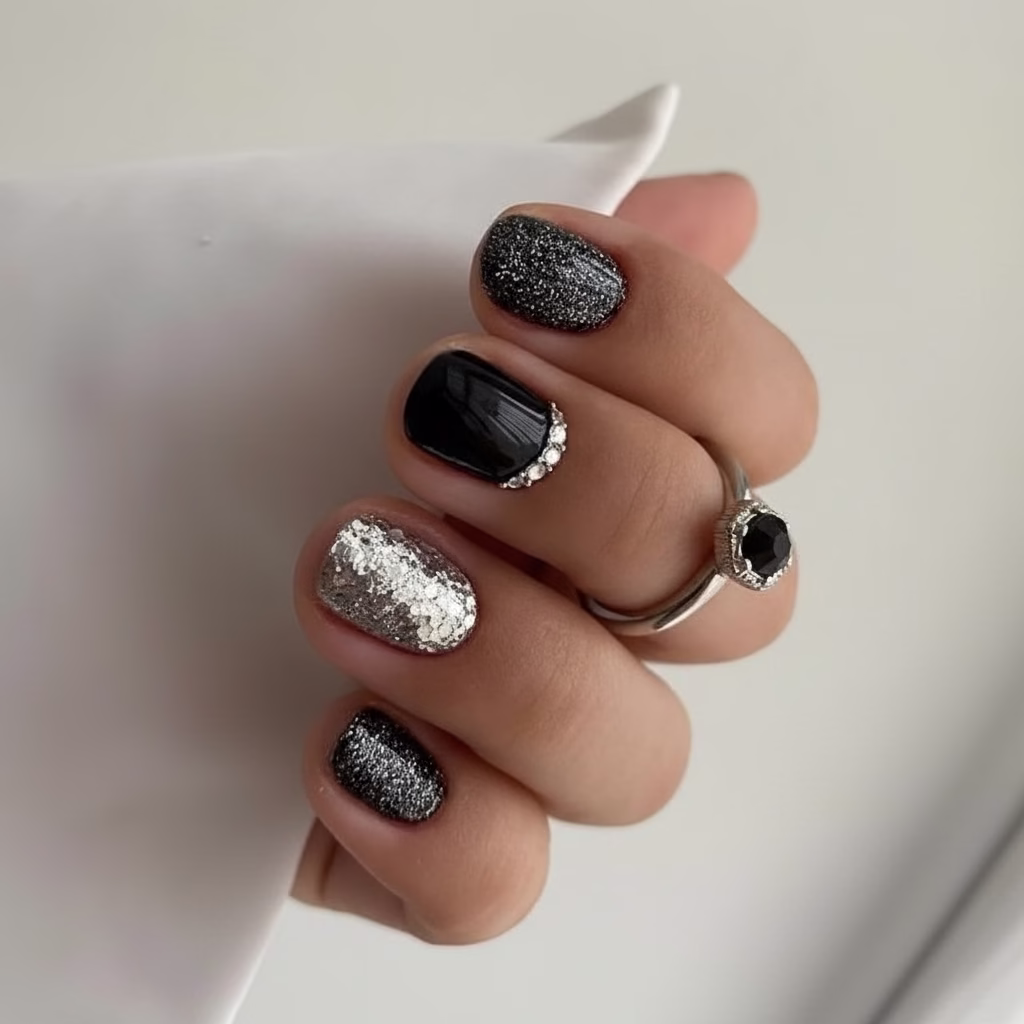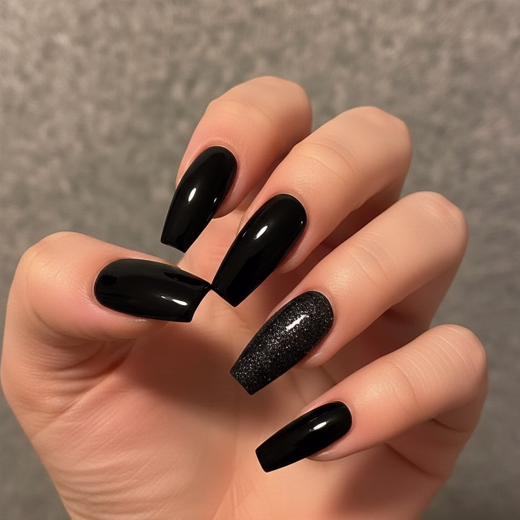 Ob Abendveranstaltung, festlicher Anlass oder stilvoller Alltag – schwarze Nägel mit Glitzer wirken immer passend. Sie vermitteln Stärke, Eleganz und einen Hauch Extravaganz.