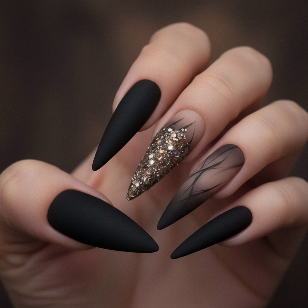 Schwarze Nägel mit Glitzer wirken dadurch modern und hochwertig – ein Look, der bewusst gewählt erscheint.