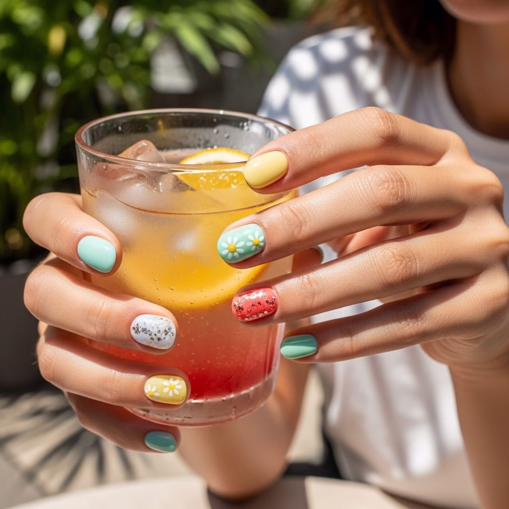 Kurze Nägel mit runder Form, die besonders im Sommer beliebt sind.