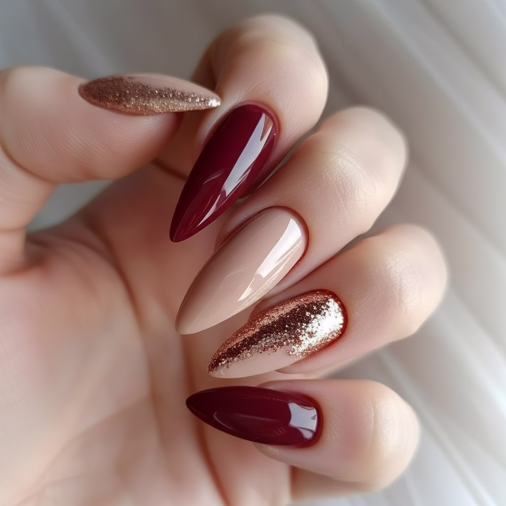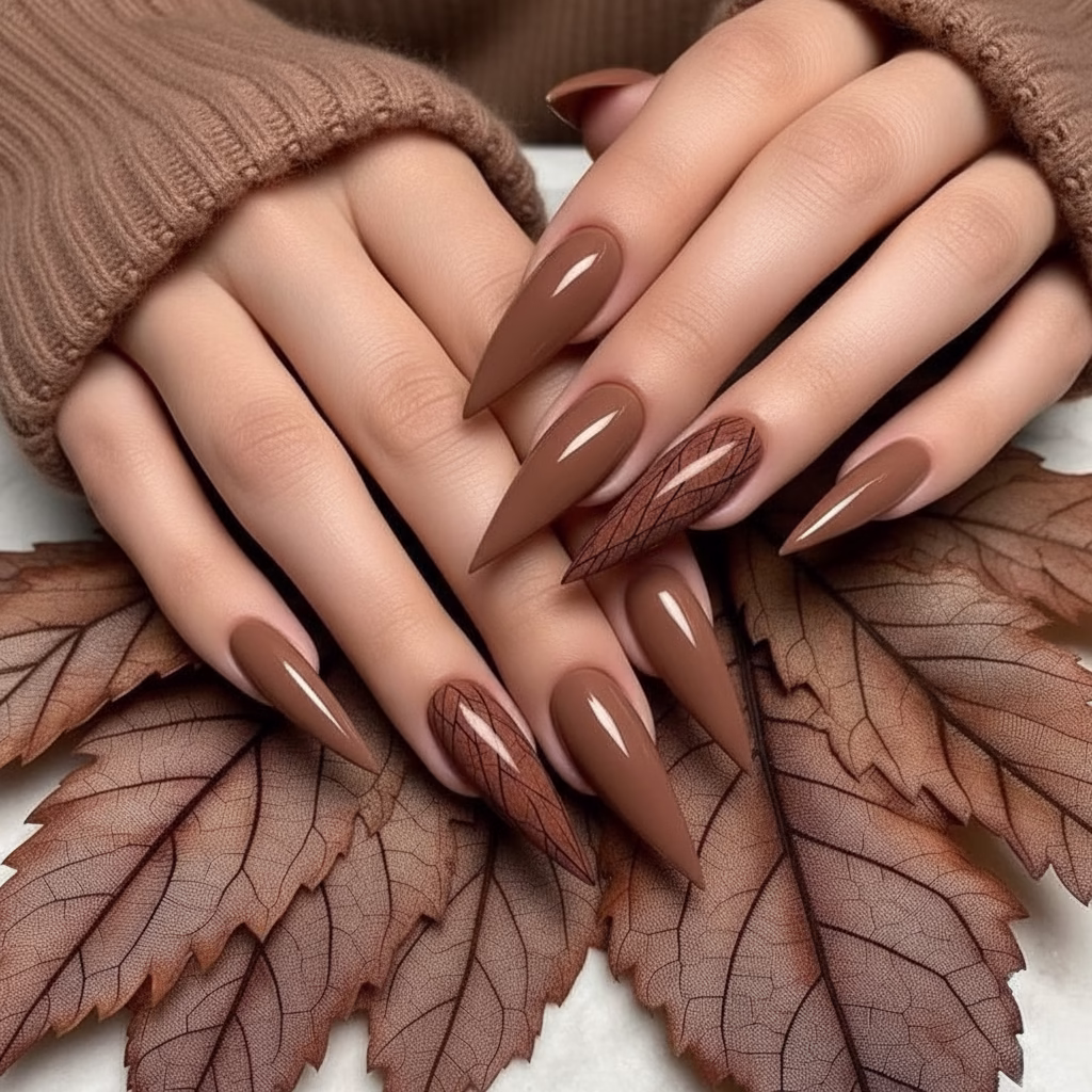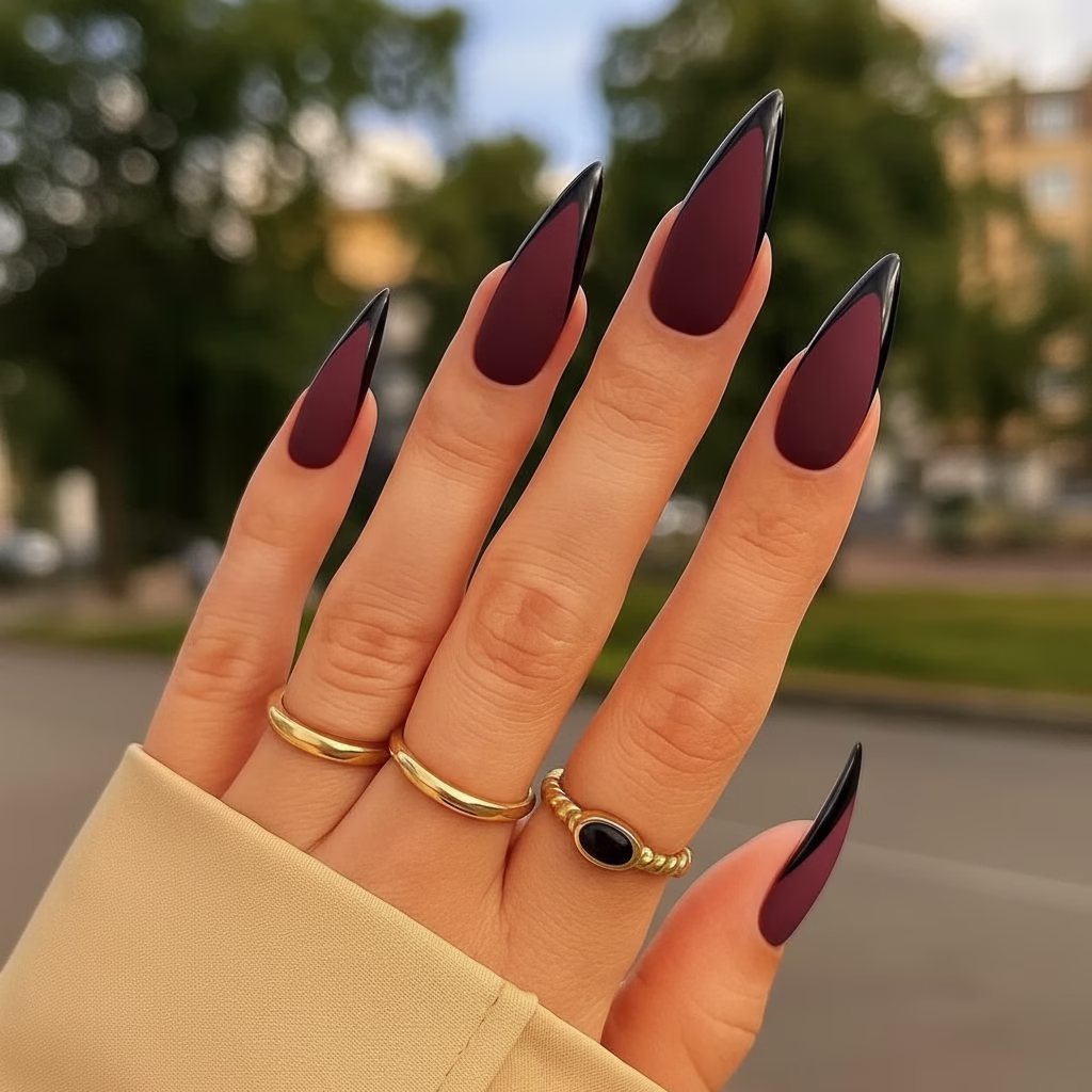 Typische Herbstfarben unterstreichen die Wirkung der Stiletto-Form besonders stark. Tiefe, satte Töne harmonieren perfekt mit der spitzen Silhouette und verleihen dem Look eine luxuriöse Note.