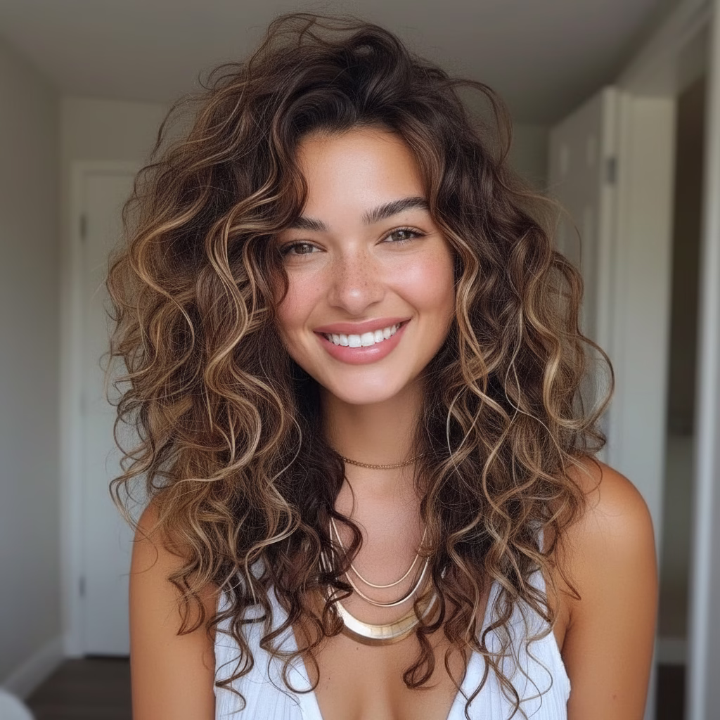 Braune lockige Haare mit Strähnen wirken selbstbewusst und gepflegt. Sie zeigen Stilgefühl und Sinn für Details. Der Look wirkt nicht inszeniert, sondern authentisch und zeitgemäß.