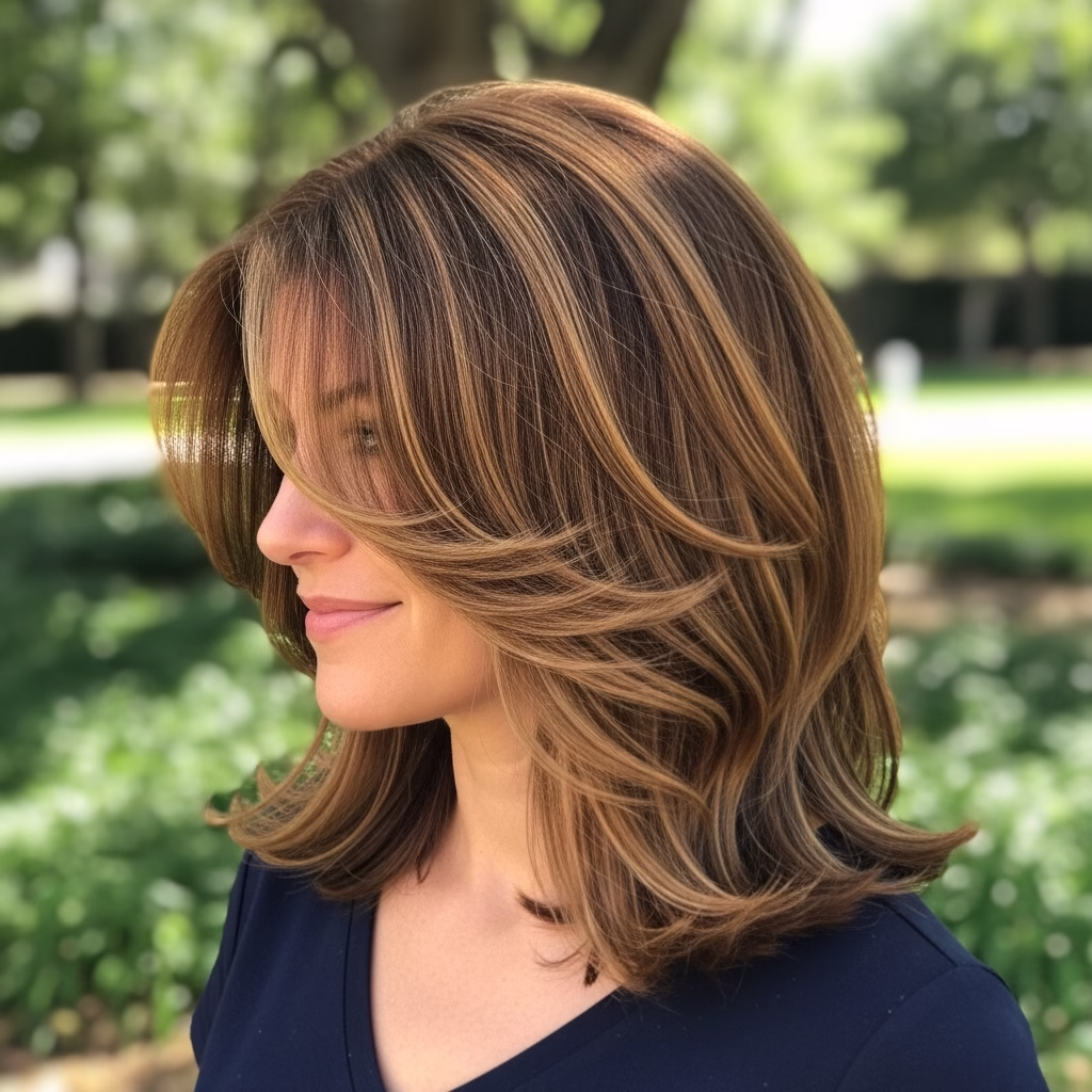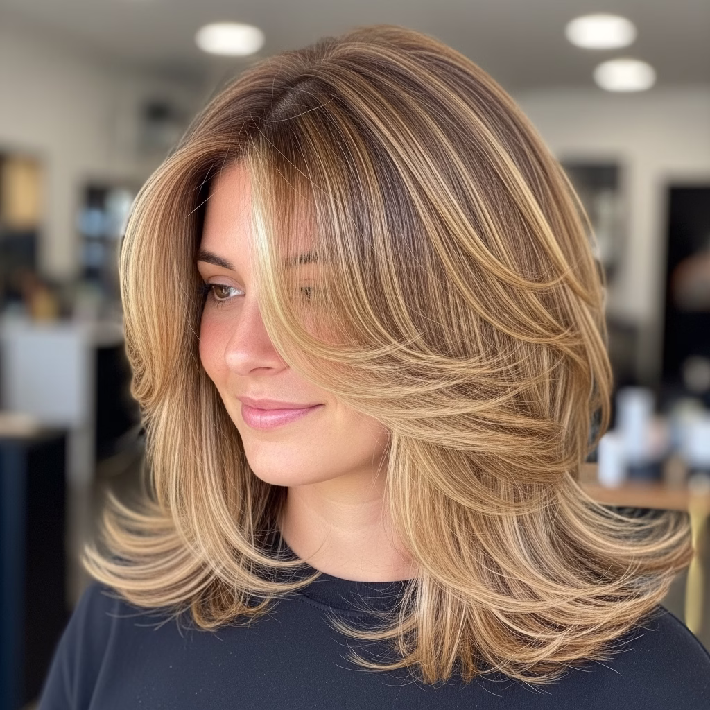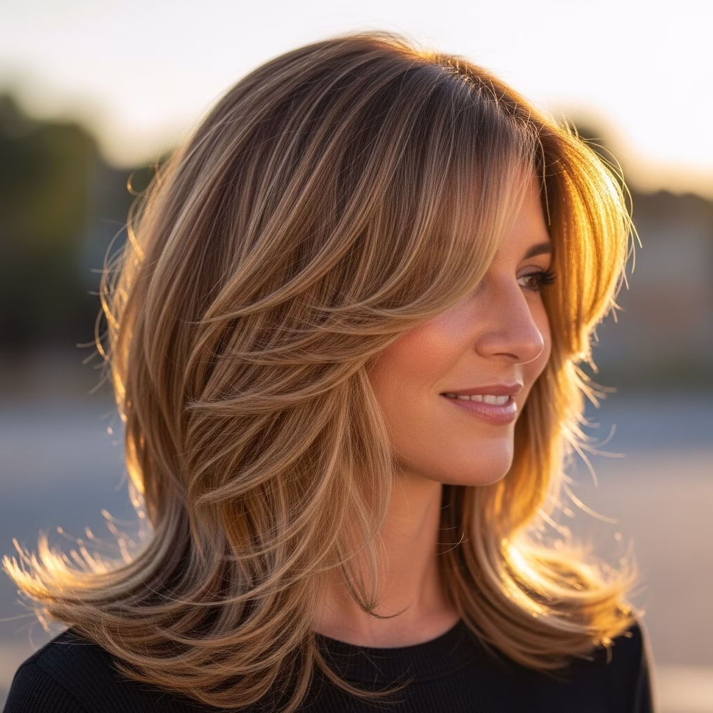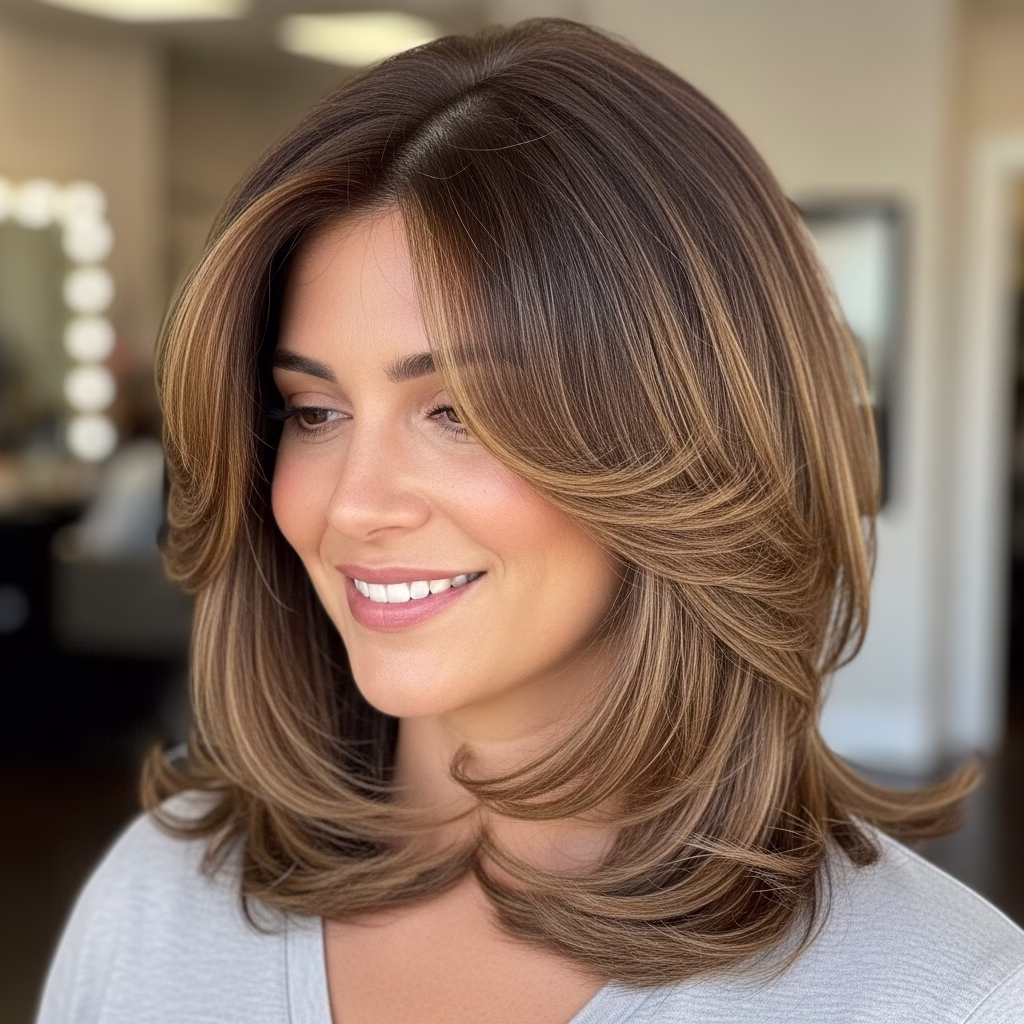 Mittellange Stufenschnitte sind bekannt für ihre voluminöse Wirkung. Durch die gestaffelten Längen wirkt das Haar luftiger und beweglicher. Gleichzeitig bleibt die Frisur kontrolliert und stilvoll.