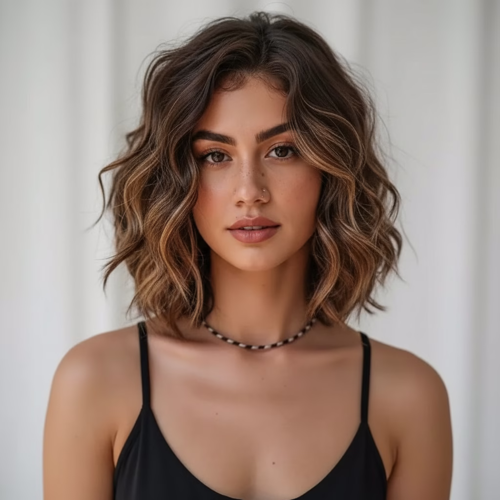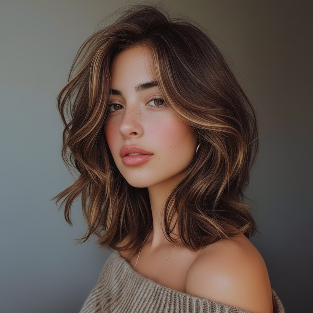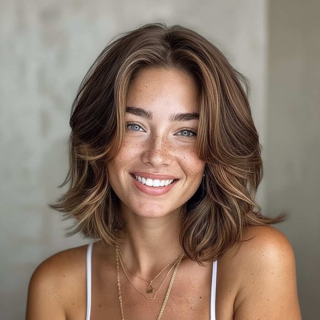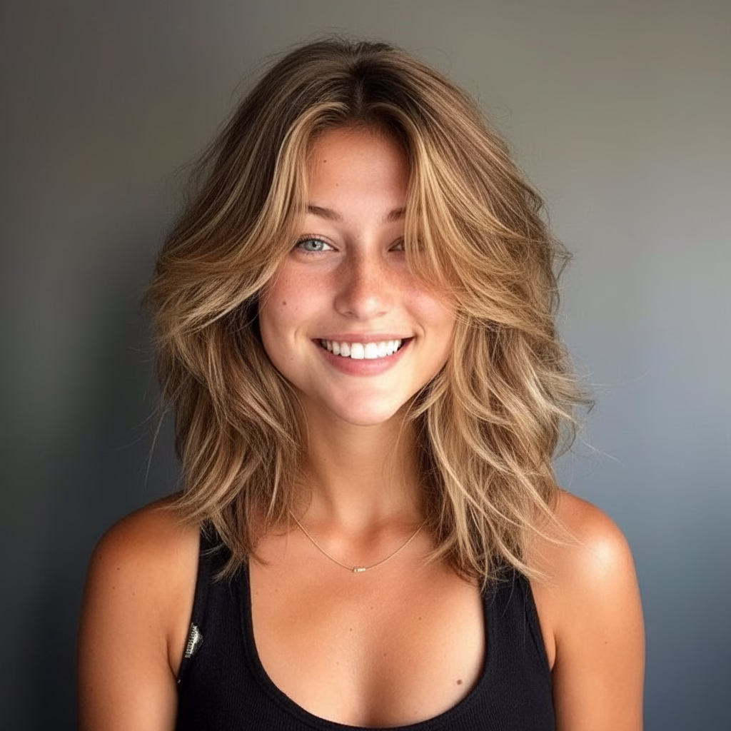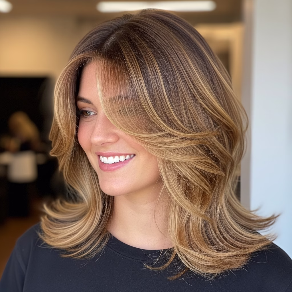 Mittellange Stufenschnitte sind bekannt für ihre voluminöse Wirkung. Durch die gestaffelten Längen wirkt das Haar luftiger und beweglicher. Gleichzeitig bleibt die Frisur kontrolliert und stilvoll.