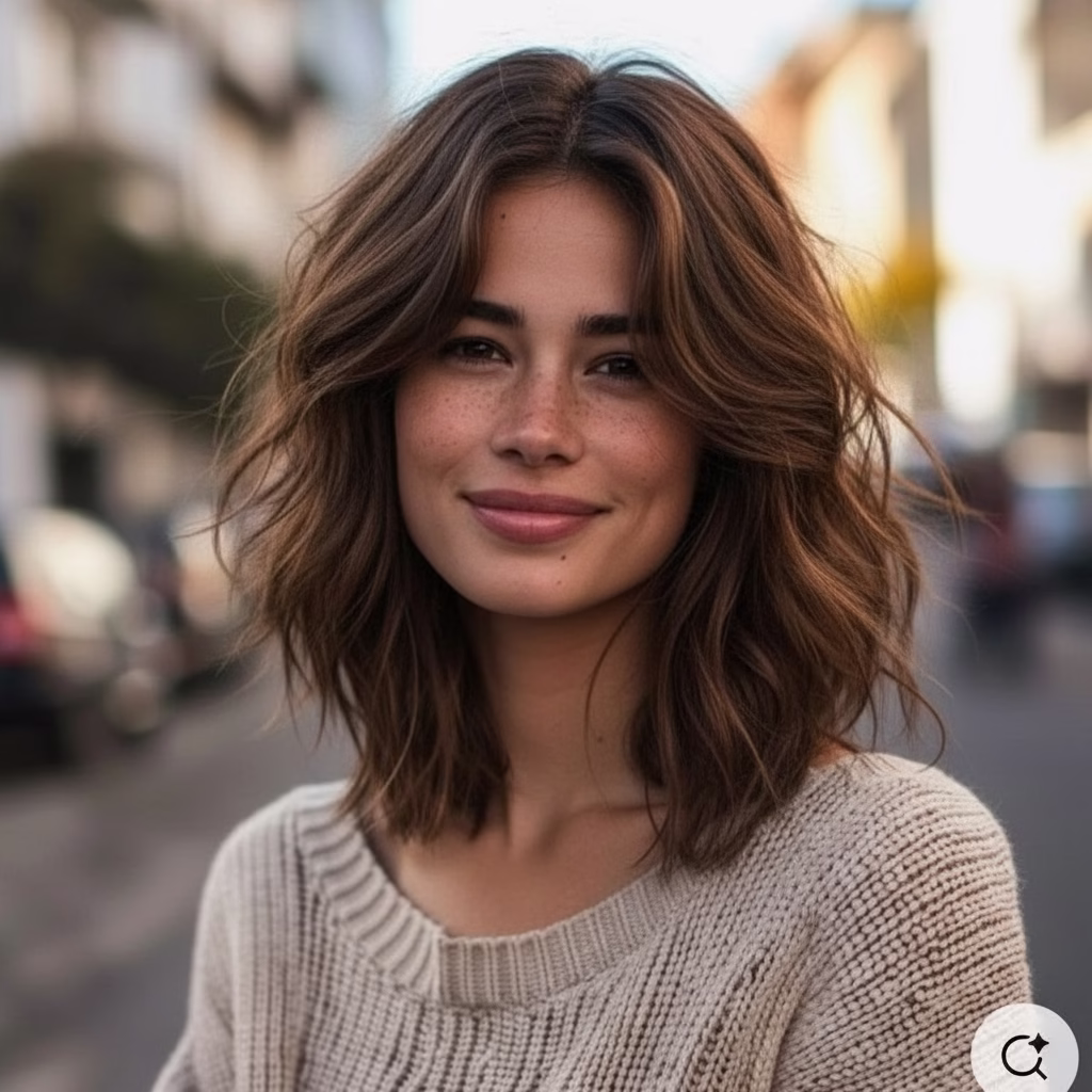 Weiblichkeit wird heute nicht mehr über starre Ideale definiert. Der mittellange Stufenschnitt spiegelt dieses moderne Verständnis wider. Er wirkt selbstbewusst, flexibel und authentisch.