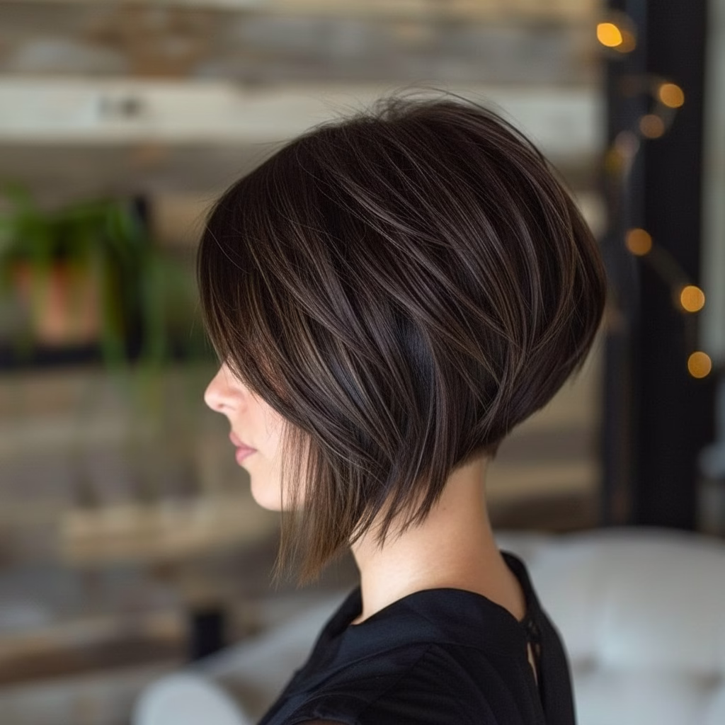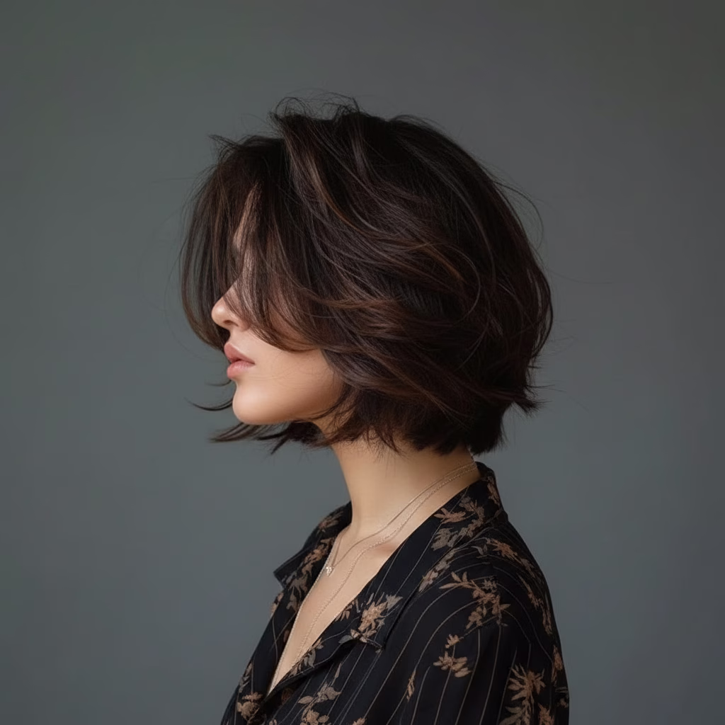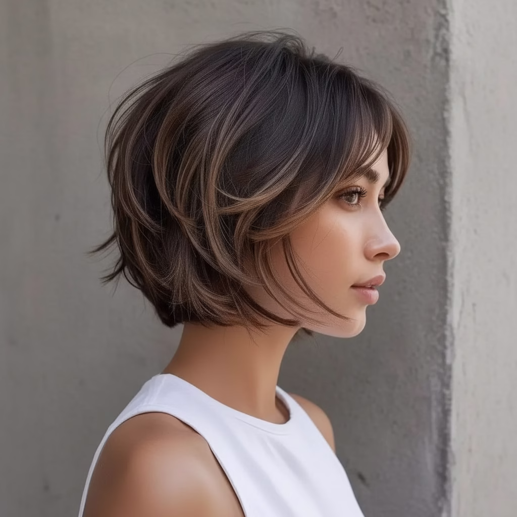 Kurze glatte Haare mit Stufenschnitt stehen für moderne Ästhetik. Sie wirken bewusst gestaltet, ohne künstlich zu erscheinen.