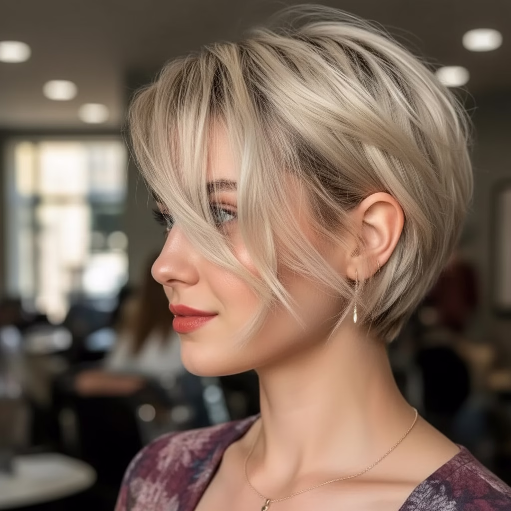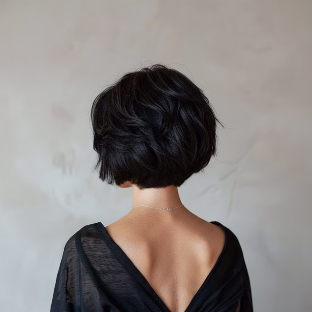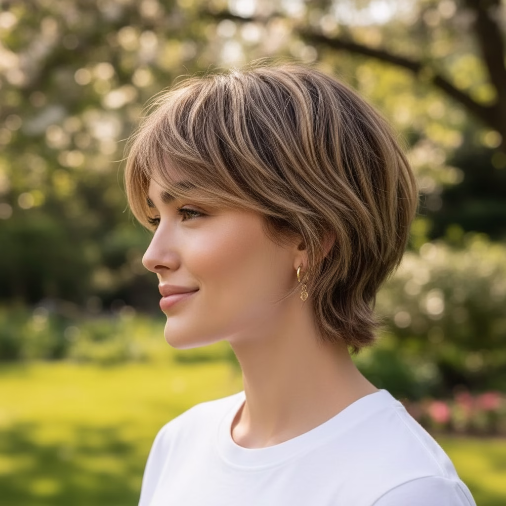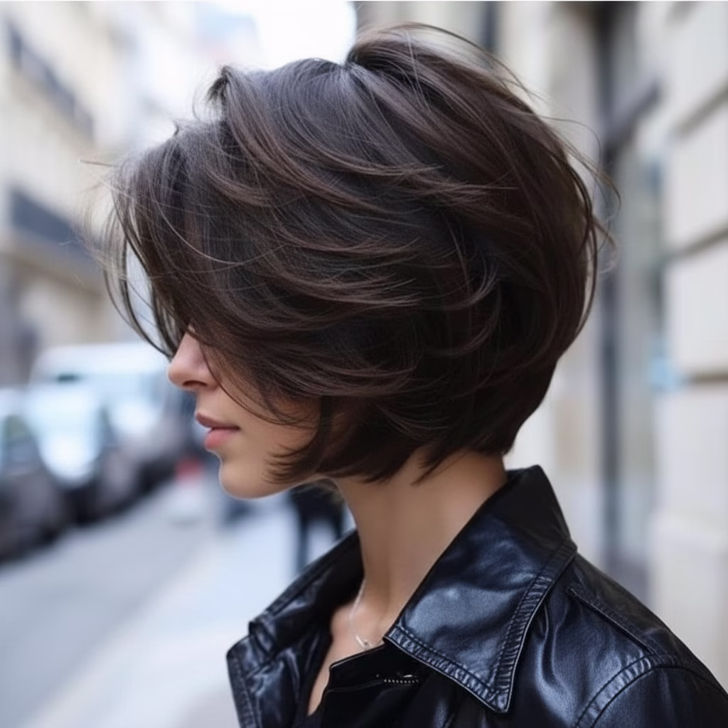 Der kurze Stufenschnitt verbindet Ausdrucksstärke mit Einfachheit. Er wirkt präsent, ohne aufdringlich zu sein.