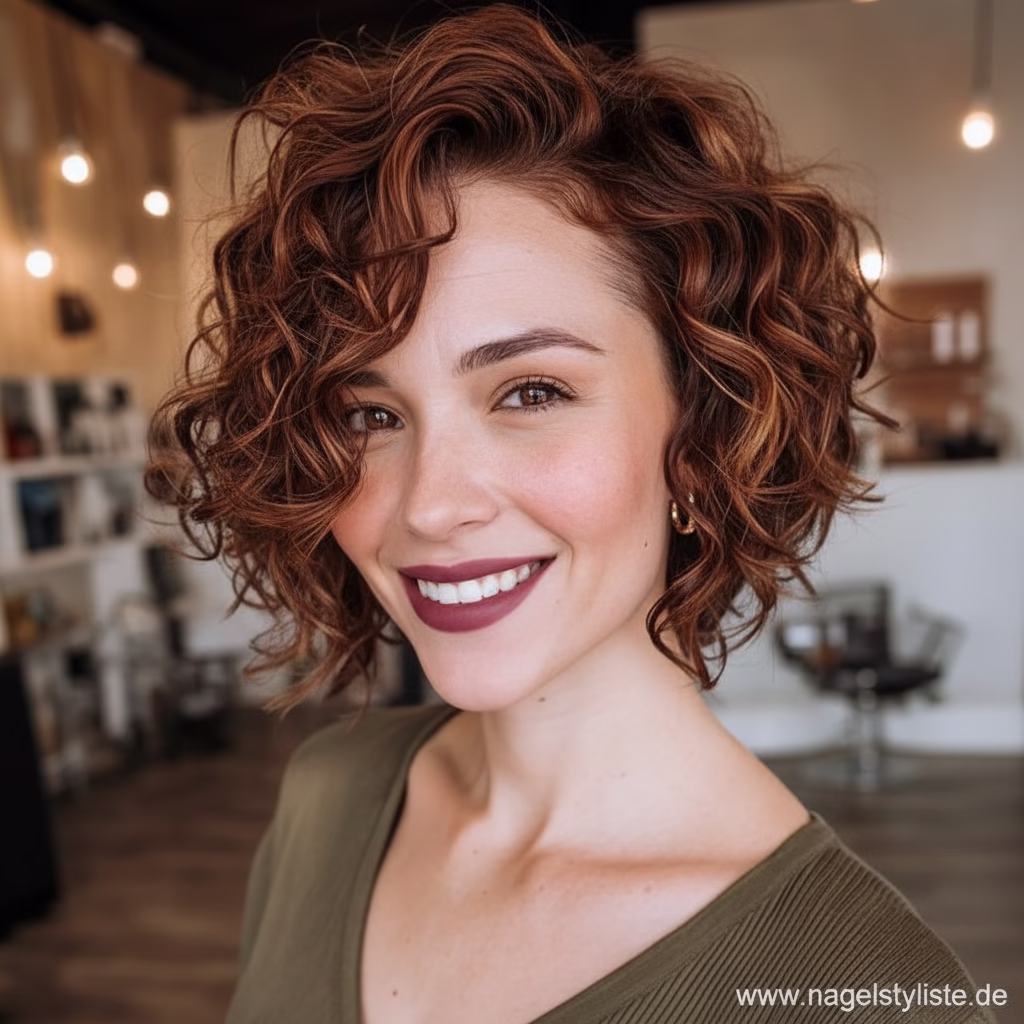 Kupfer- und Rottöne gehören zu den Trendfarben 2025 und verleihen lockigen Stufenschnitten Tiefe und Ausdruckskraft. Besonders kurze Locken profitieren von den warmen Reflexen, die jeder Strähne eine besondere Dimension geben.