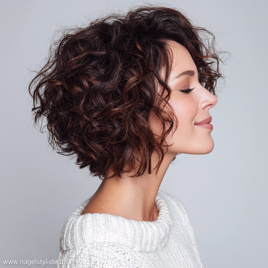Der Short Curly Bob ist ideal für Frauen, die etwas Länge behalten möchten, aber dennoch von den Vorteilen kurzer Locken profitieren wollen. Durch geschickt platzierte Stufen wirken die Locken federleicht und fallen deutlich definierter. Die Bobform sorgt für eine elegante Silhouette, während die Stufen Lebendigkeit hineinbringen. Ob mit seitlichem Akzent oder leicht asymmetrisch – der Curly Bob ist vielseitig und zeitlos.