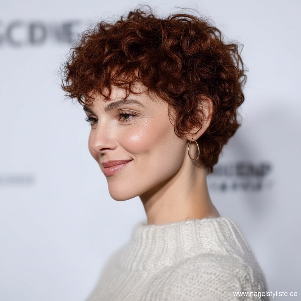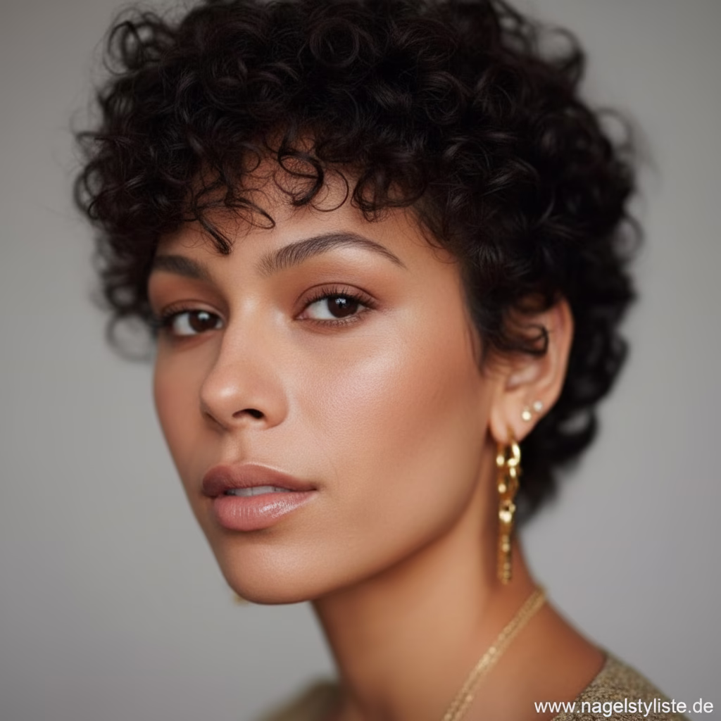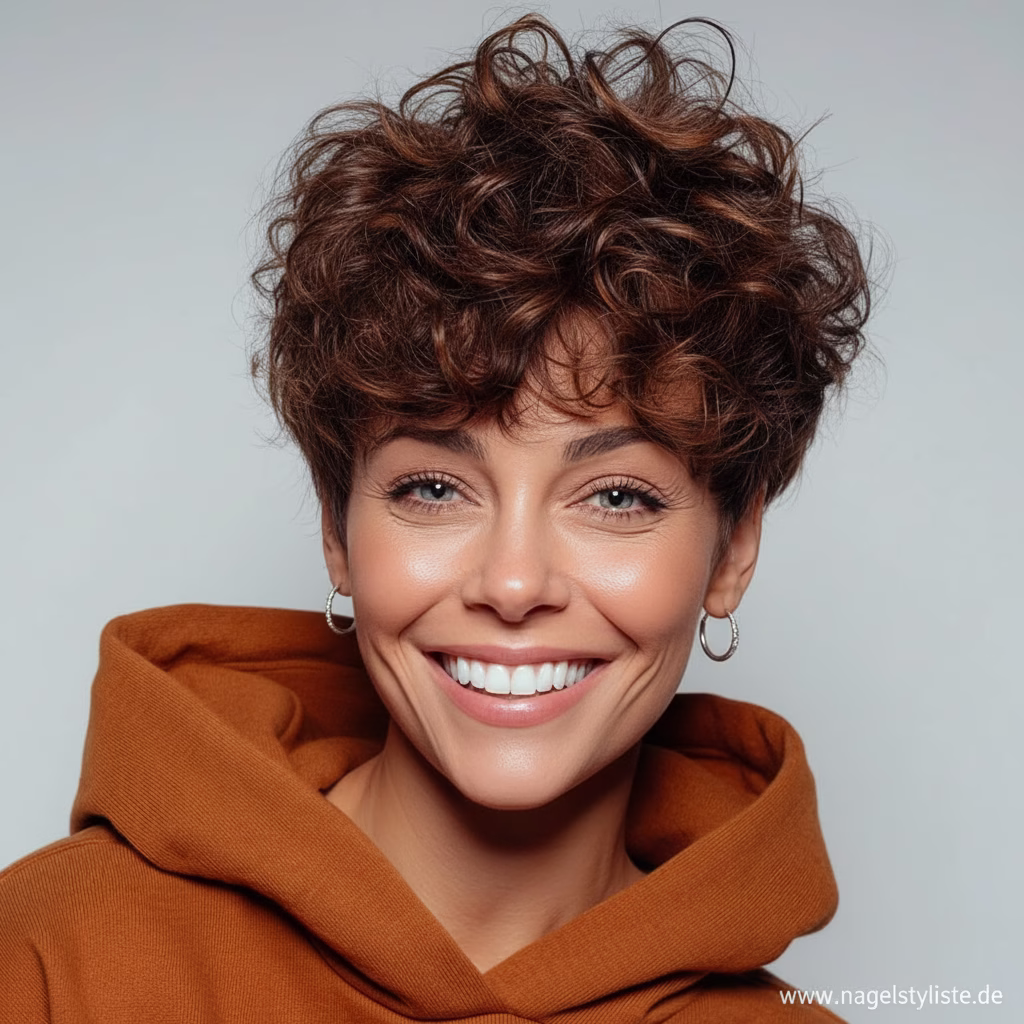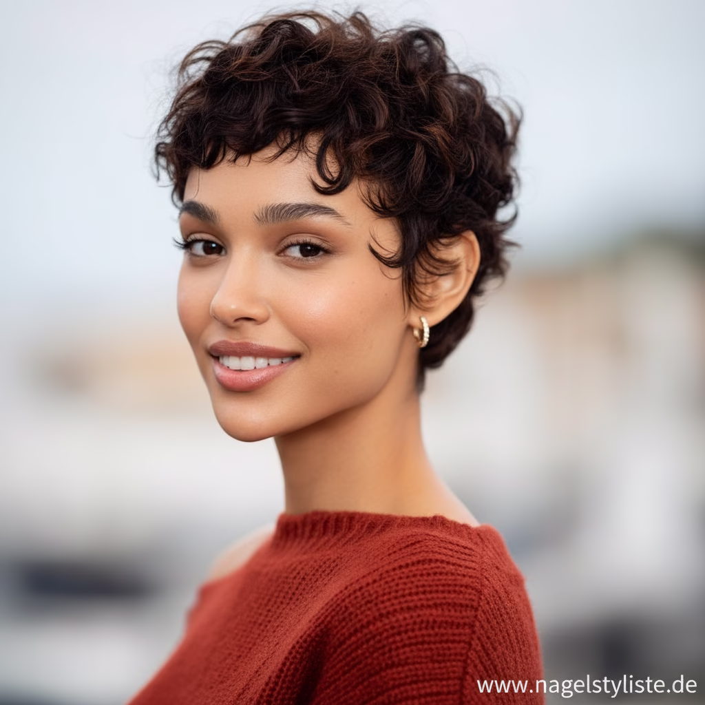 Der Curly Pixie Cut gehört derzeit zu den beliebtesten Varianten. Die Kombination aus kurzen Seiten und einem etwas längeren Oberkopf bringt Definition und Volumen zusammen. Die Stufen im Deckhaar verhindern, dass der Pixie zu kompakt wirkt, und betonen die lockige Struktur optimal. Dieser Look wirkt frisch, verspielt und gleichzeitig modern.