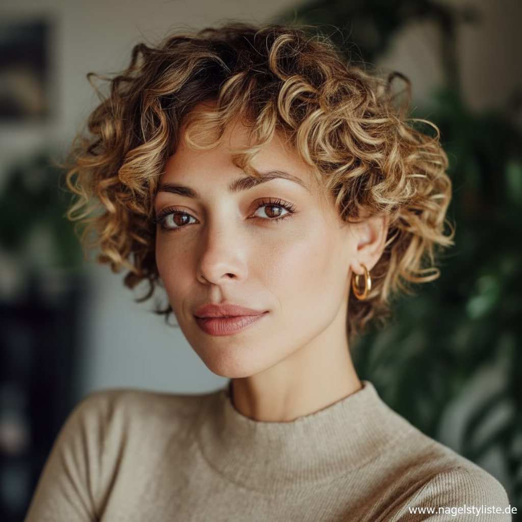 Warme Blondtöne wie Honigblond, Sandblond oder Buttercream passen ideal zu lockigen Kurzhaarschnitten. Sie reflektieren das Licht weicher und lassen einzelne Locken besonders lebendig wirken.