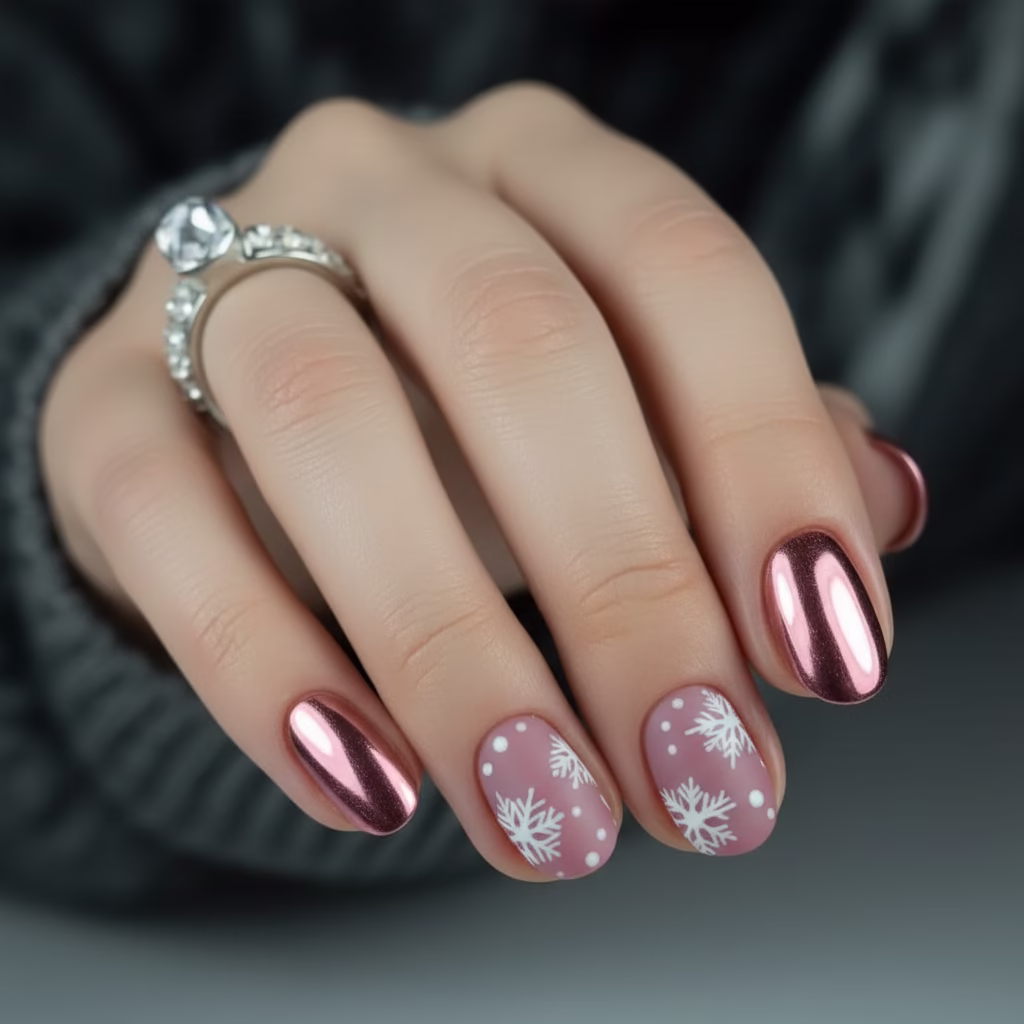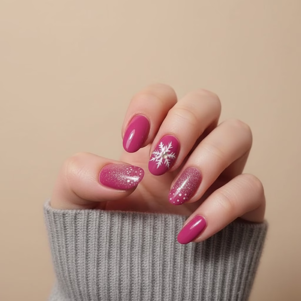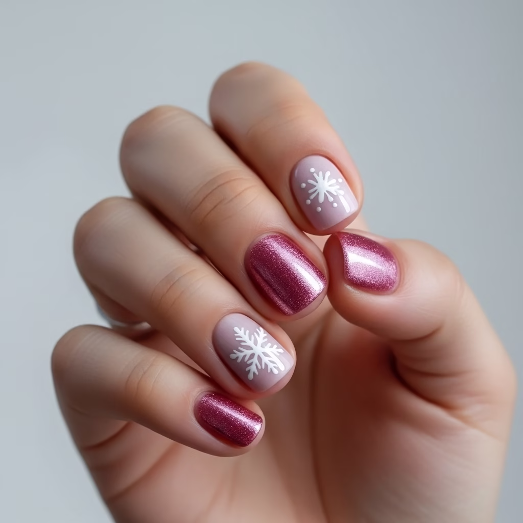 Besonders beliebt sind Veredelungen, die Pink mit winterlichen Elementen verbinden – etwa frosty schimmernde Highlights, leichte Nuancen in Weiß oder dezente Silberdetails, die dem Look zusätzliche Eleganz verleihen.