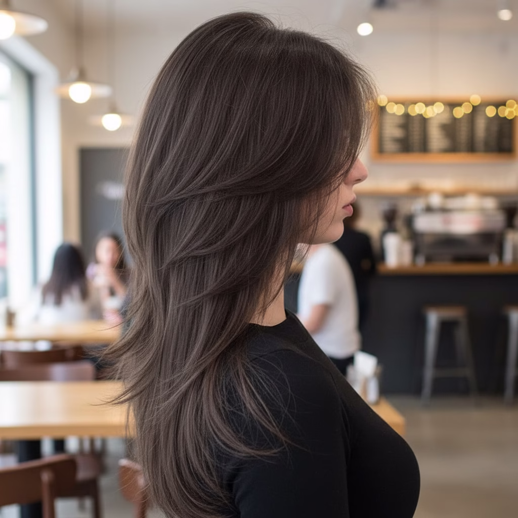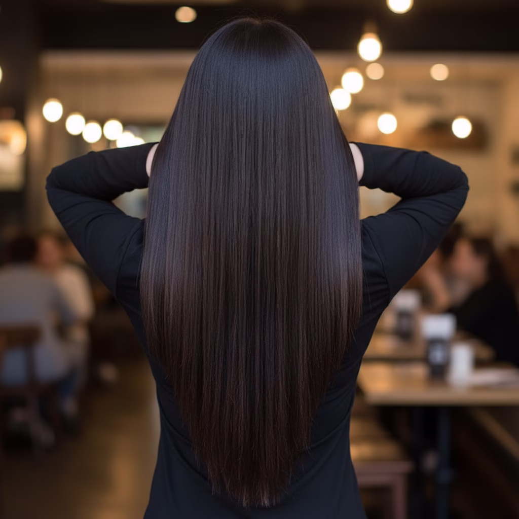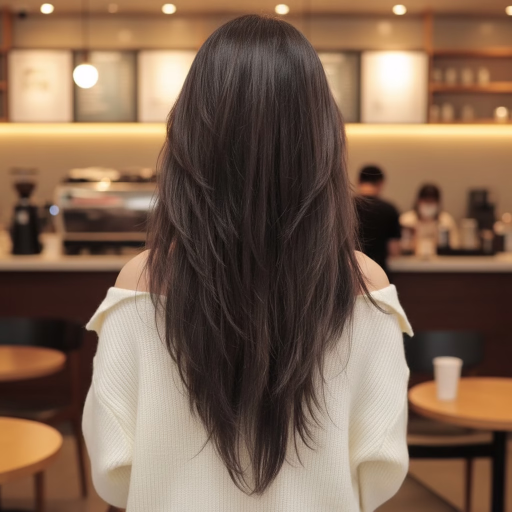 Im Gegensatz zu geraden oder stark gestuften Schnitten wirkt der V Schnitt fließend und ausgewogen. Er schafft eine klare Silhouette, ohne die Länge zu dominieren, und unterstreicht die natürliche Schönheit langer Haare.