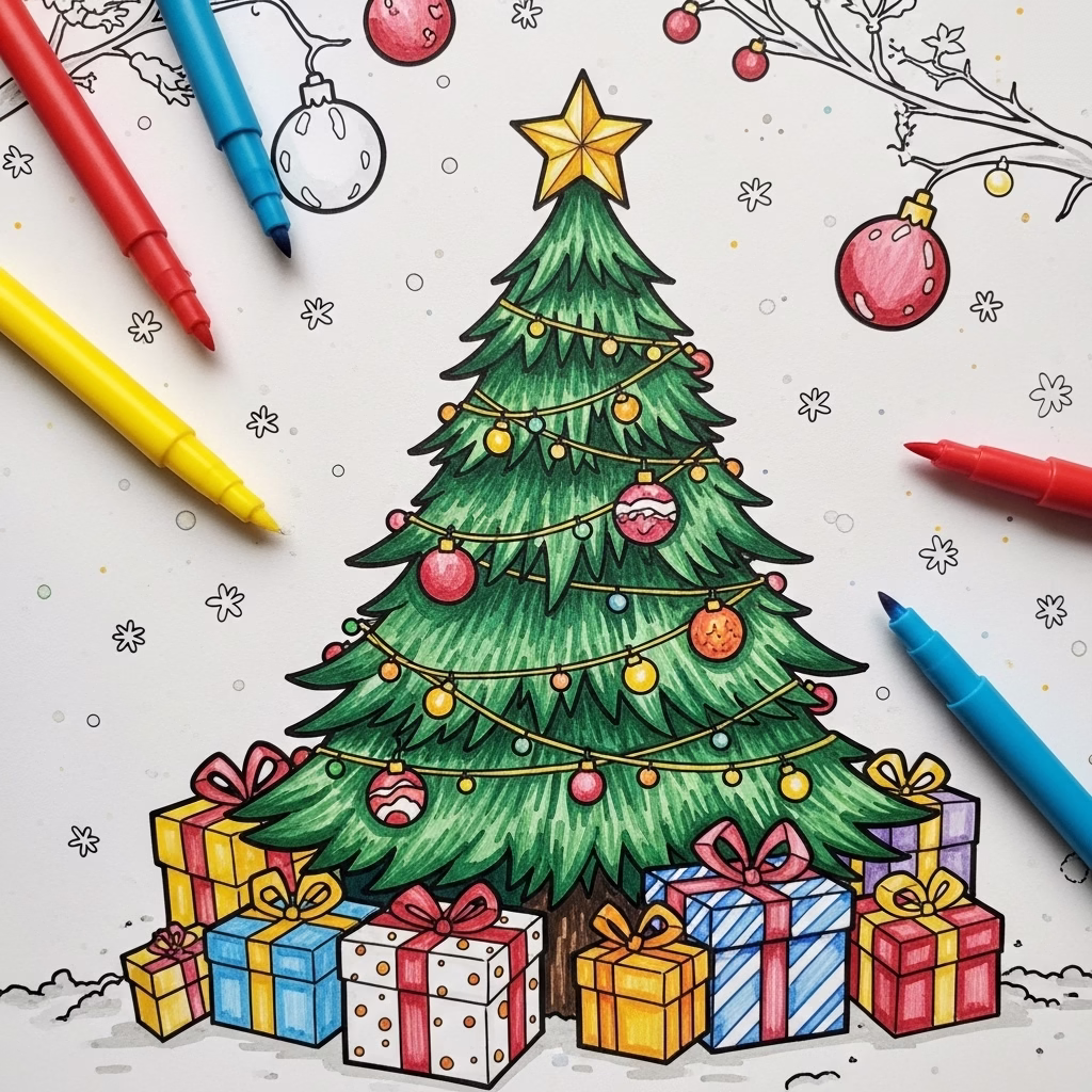 Weihnachtliche Symbole tragen starke emotionale Bedeutungen. Ein geschmückter Tannenbaum steht für Geborgenheit, ein Stern für Hoffnung, Schnee für Stille. Ausmalbilder machen diese Motive bewusst erlebbar und laden dazu ein, sich Zeit zu nehmen und innezuhalten.