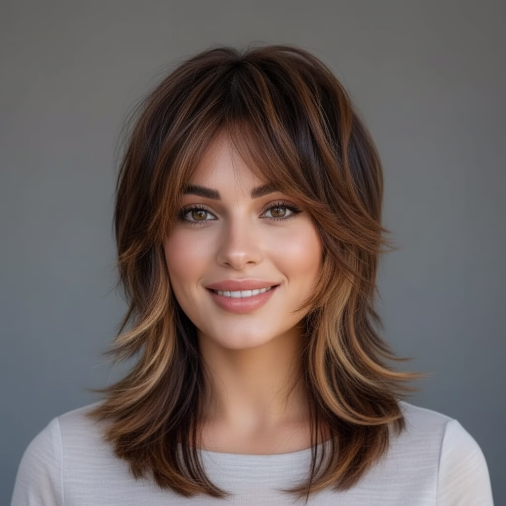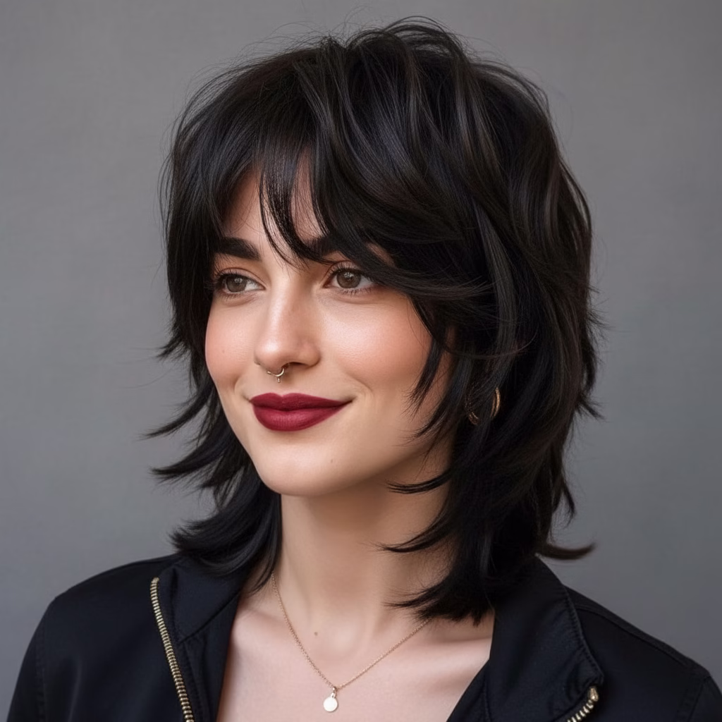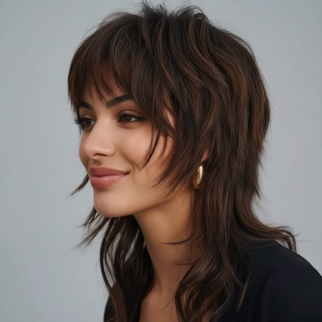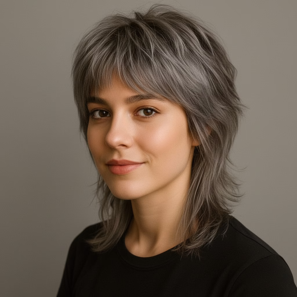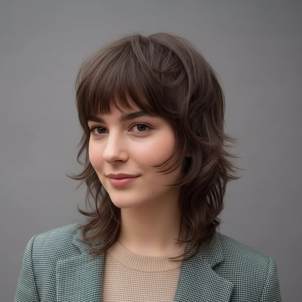 Der Wolf Cut für mittellange Haare kann je nach Gesamtstil ruhig oder rebellisch wirken. Diese Wandelbarkeit verleiht dem Schnitt eine besondere Vielseitigkeit, ohne seine charakteristische Struktur zu verlieren.